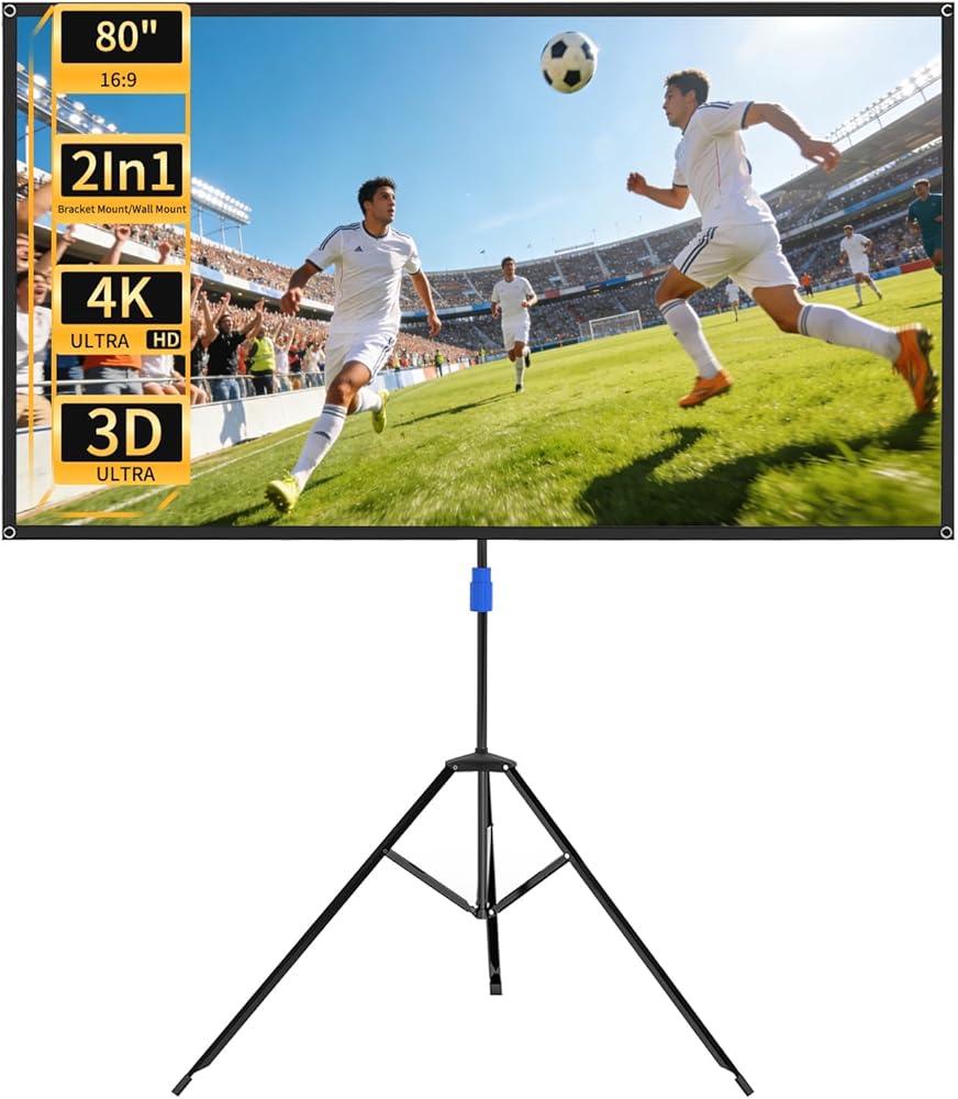 شاشة بروجيكتور مقاس 80 بوصة من WASJOYE مع حامل - شاشة بروجيكتور محمولة بدقة 16:9 بدقة 4K عالية الدقة، شاشة عرض داخلية 1.2 كسب، سهلة الإعداد والحمل، للسينما المنزلية، ولعبة التلفزيون في مكتب الفناء الخلفي