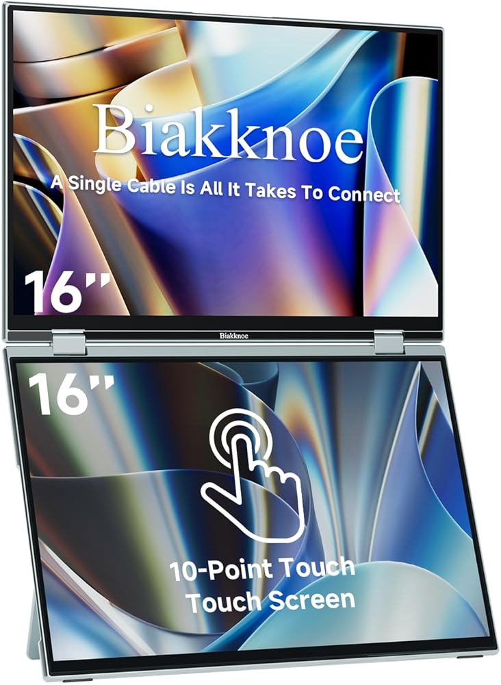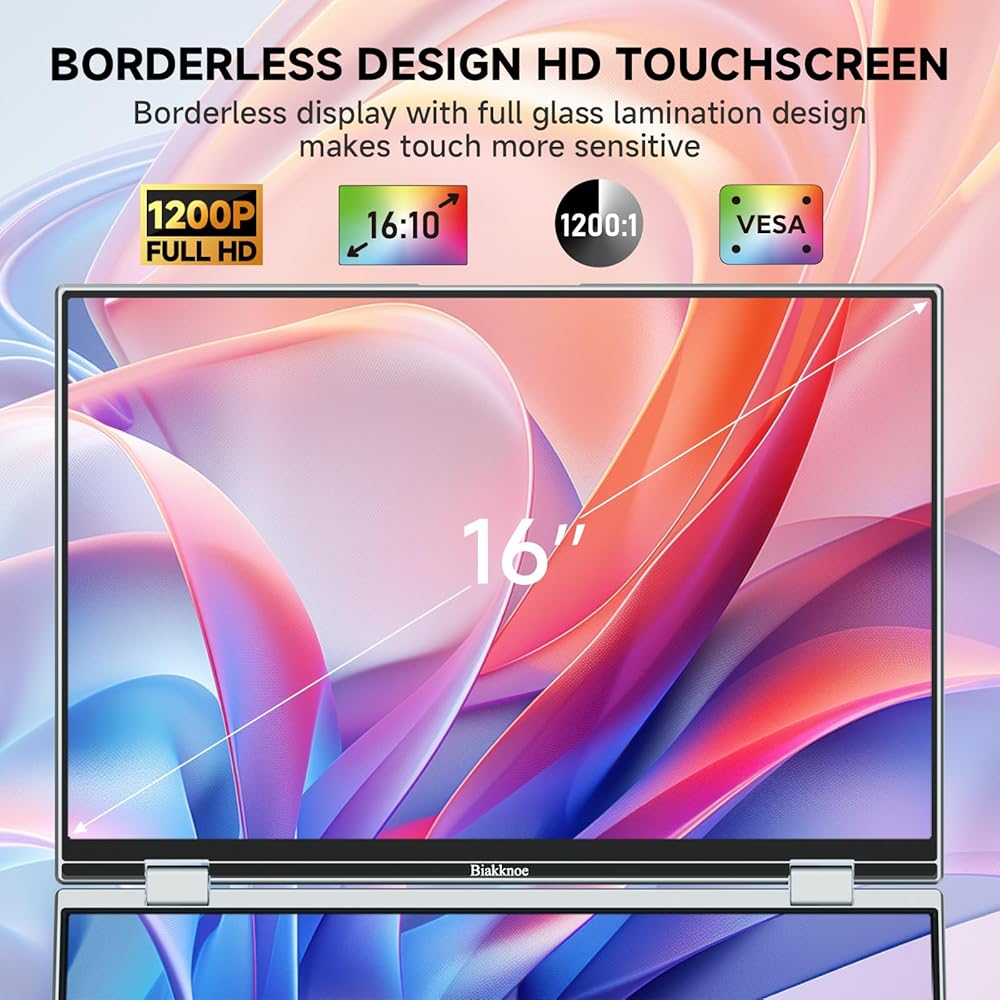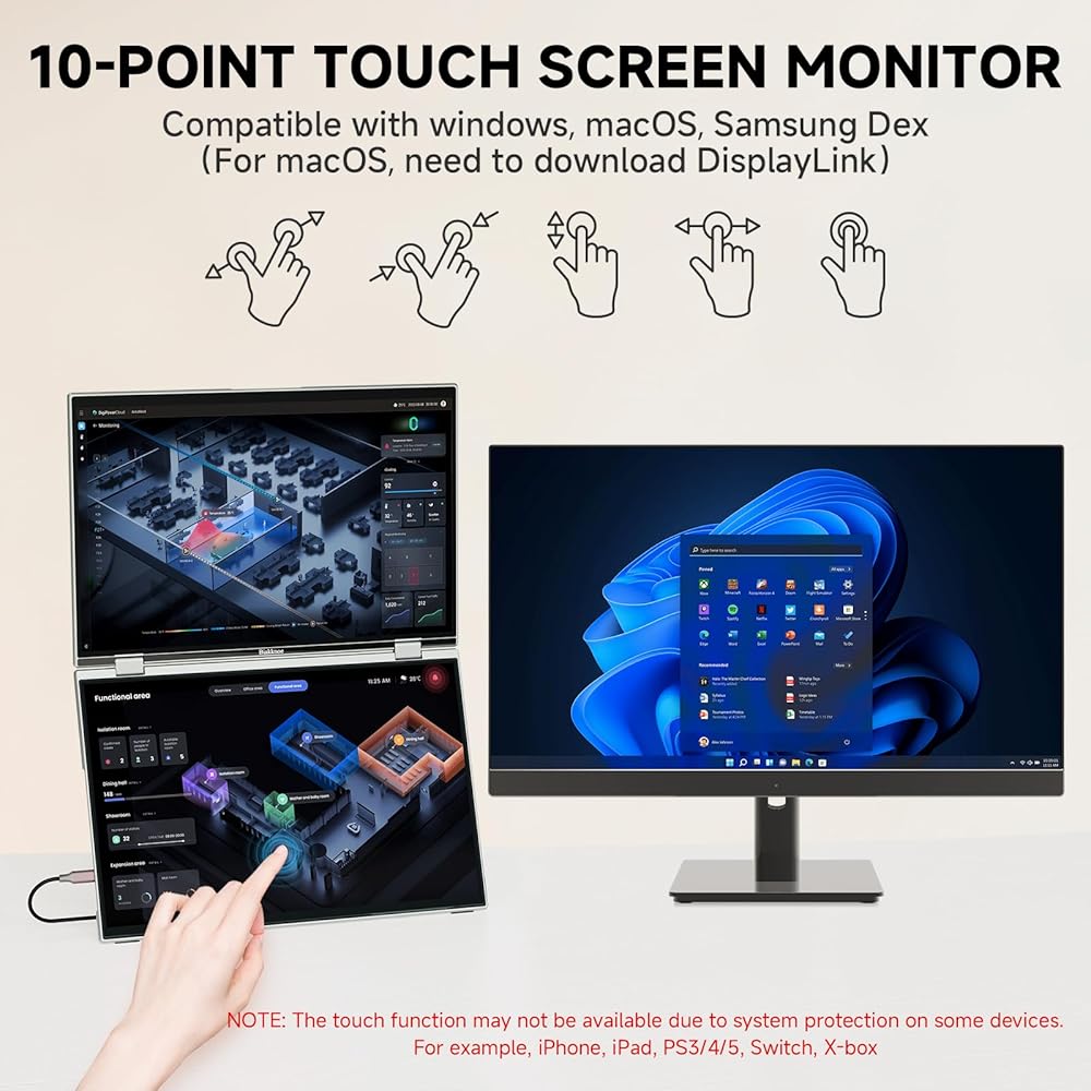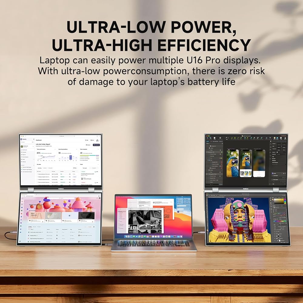 • شاشة لمس ثلاثية، كفاءة بنسبة 345% - تعمل الشاشة المزدوجة القابلة للطي على توسيع مساحة العمل الخاصة بك من خلال شاشتي لمس FHD مقاس 16 بوصة، مما يوفر مساحة شاشة أكبر بمقدار 2.5 مرة من شاشة واحدة. مثالية للتشفير أو الرسوم البيانية التجارية أو تنفيذ المهام المتعددة بين المستندات ومكالمات الفيديو - لا مزيد من الإحباط في تبديل النوافذ. للحصول على إعداد دائم، فهي تدعم أيضًا التثبيت القياسي وفقًا لمعايير VESA.
