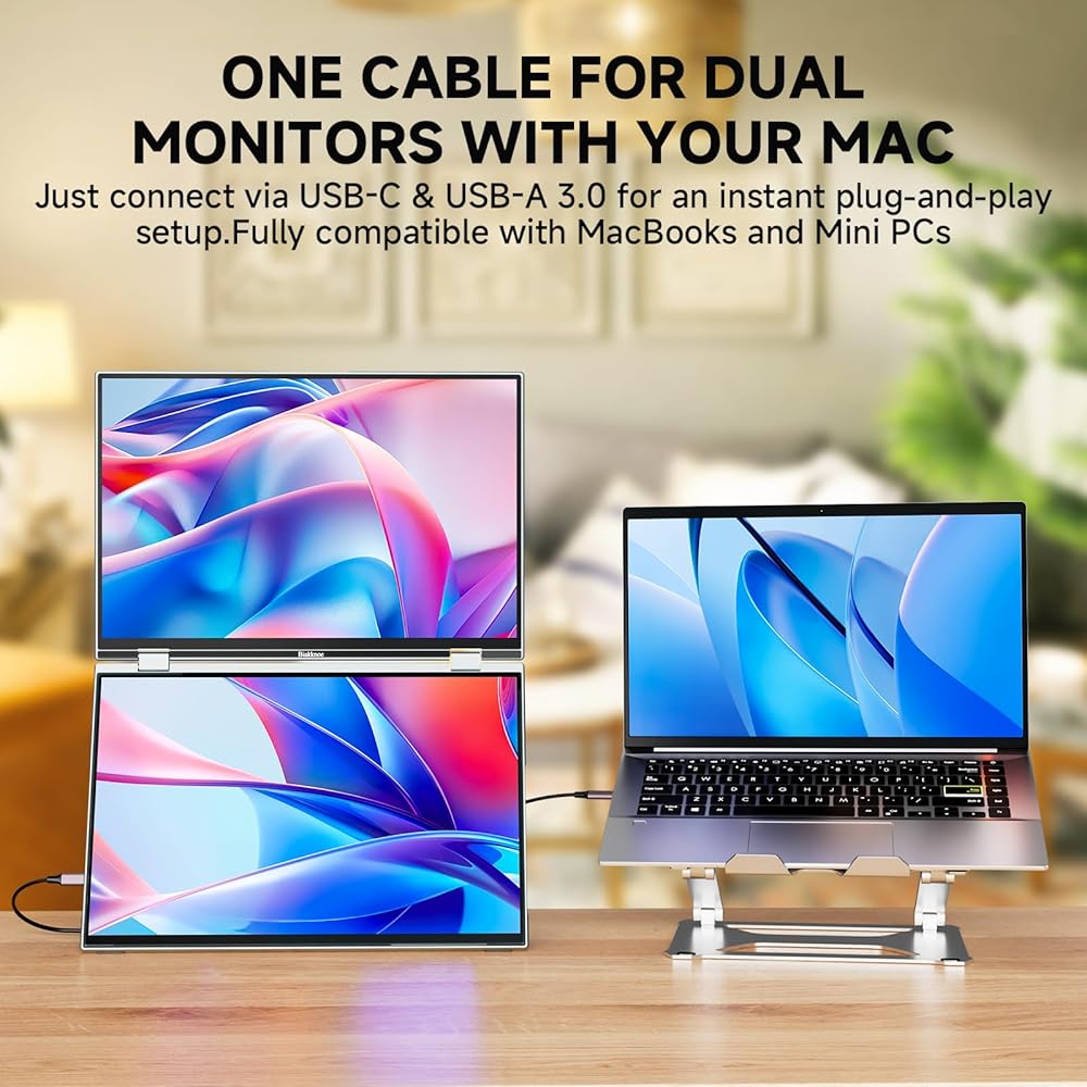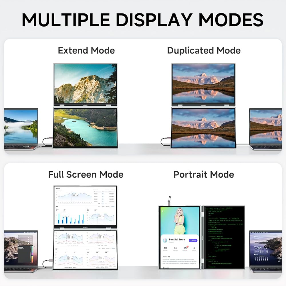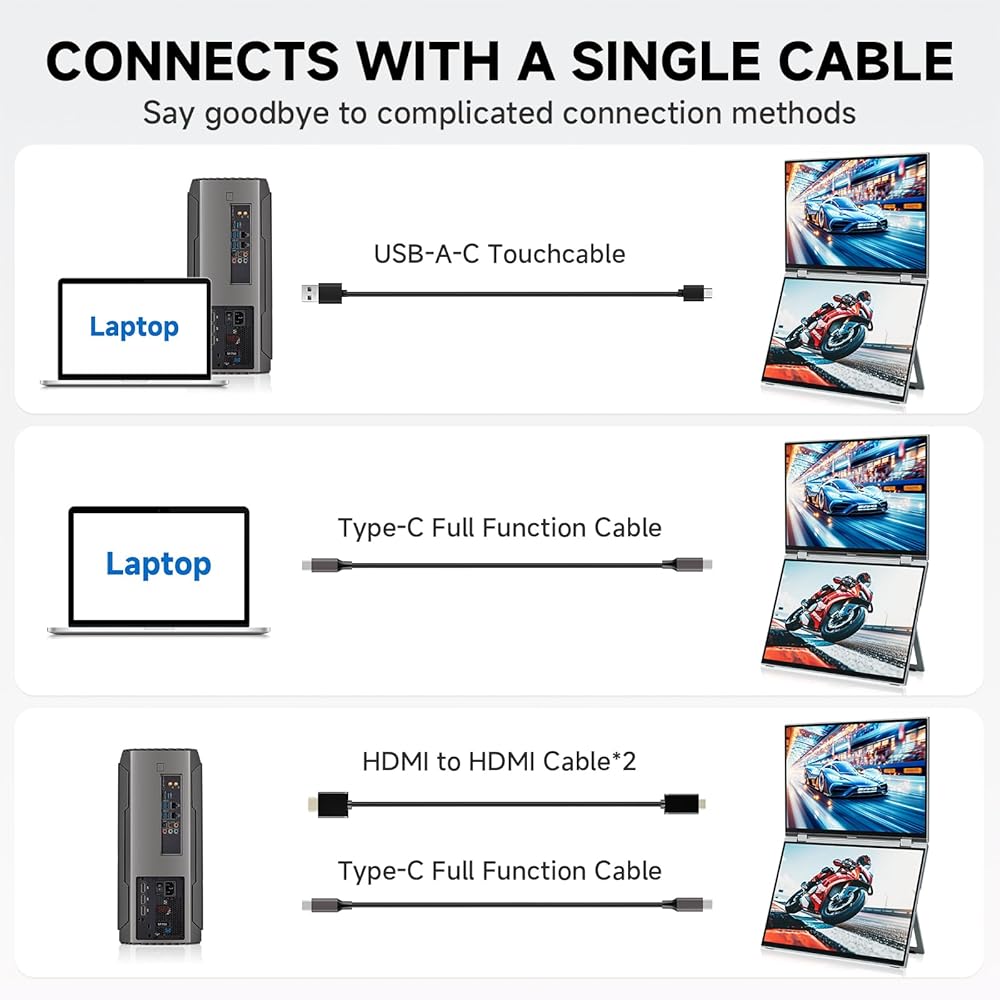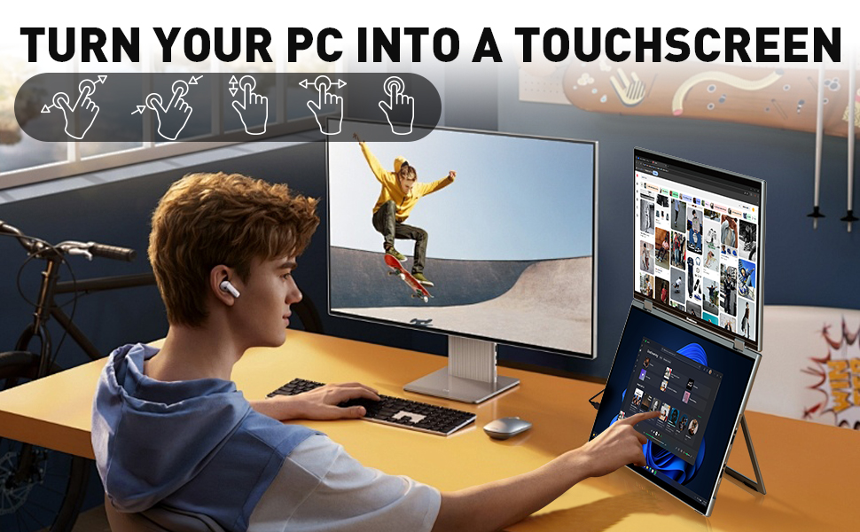 • شاشة لمس ثلاثية، كفاءة بنسبة 345% - تعمل الشاشة المزدوجة القابلة للطي على توسيع مساحة العمل الخاصة بك من خلال شاشتي لمس FHD مقاس 16 بوصة، مما يوفر مساحة شاشة أكبر بمقدار 2.5 مرة من شاشة واحدة. مثالية للتشفير أو الرسوم البيانية التجارية أو تنفيذ المهام المتعددة بين المستندات ومكالمات الفيديو - لا مزيد من الإحباط في تبديل النوافذ. للحصول على إعداد دائم، فهي تدعم أيضًا التثبيت القياسي وفقًا لمعايير VESA.