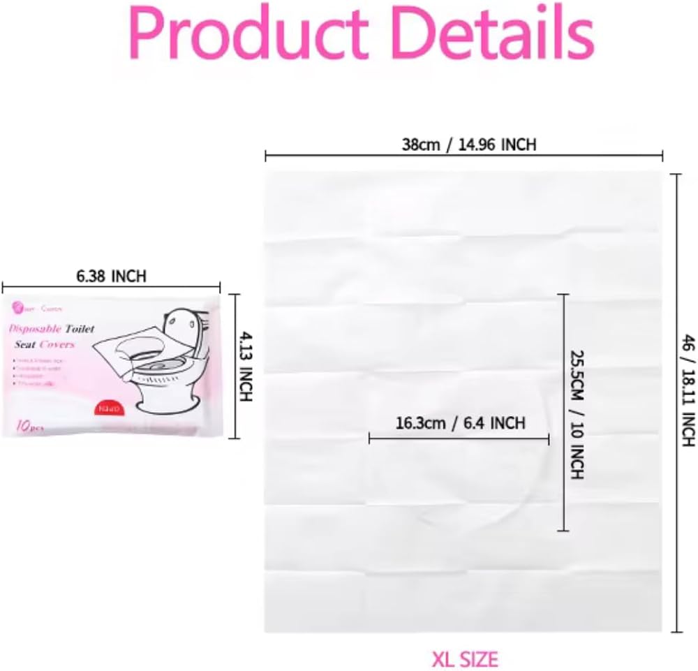 Upgrade your public restroom experience with our premium disposable toilet seat covers, Make every restroom visit more comfortable with these easy-to-use disposable toilet seat covers. Each cover is individually wrapped to ensure convenience wherever you go—whether traveling, visiting malls, working in an office, schools or spending time outdoors. The XL size provides full coverage of the toilet seat, offering a more comfortable experience compared to standard covers. the cover stays durable and steady during use without tearing or sliding. These covers are perfect for travelers, parents, and anyone who prefers an easier, more comfortable solution when using public restrooms. After use, simply discard the cover—making your restroom trips quicker, easier, and more convenient.