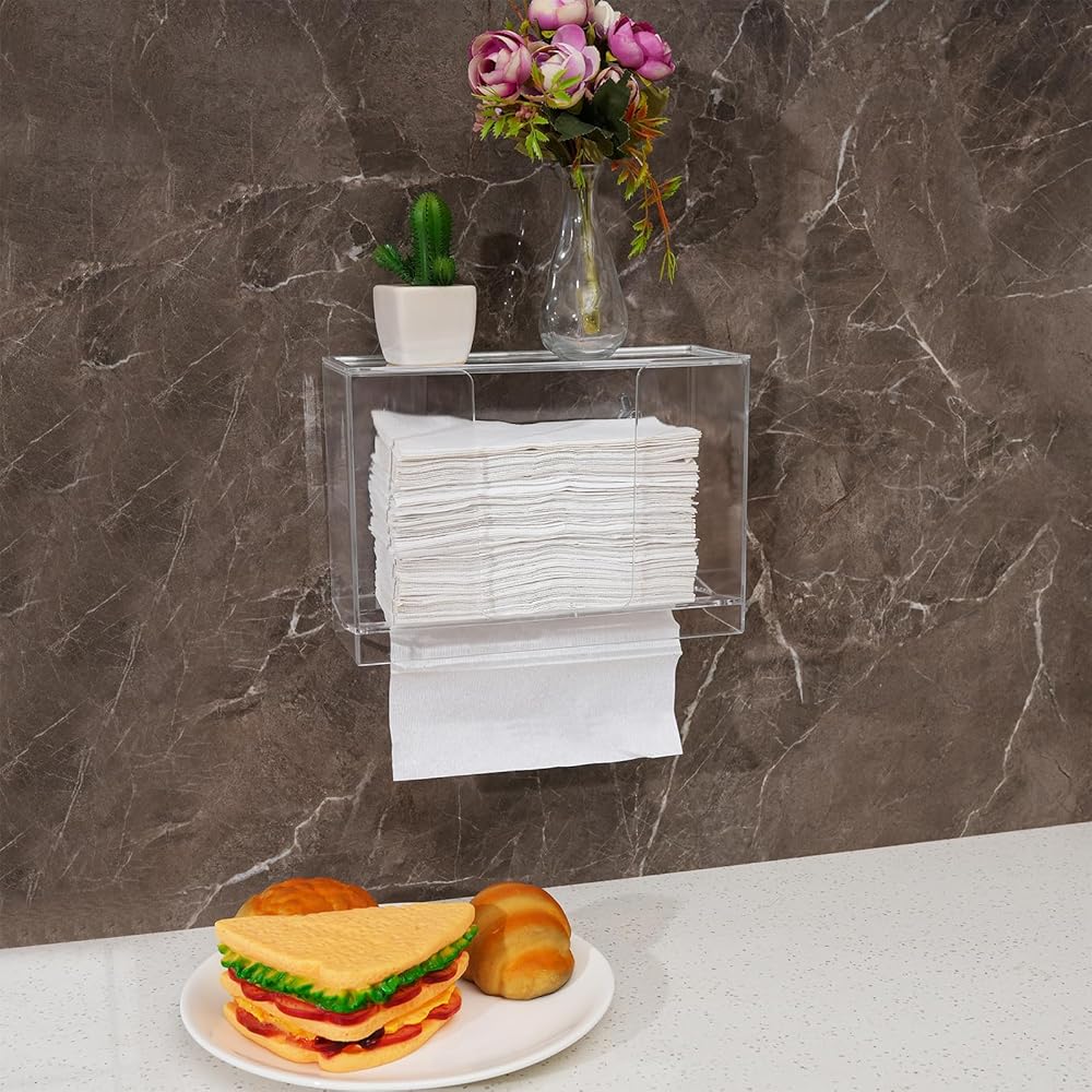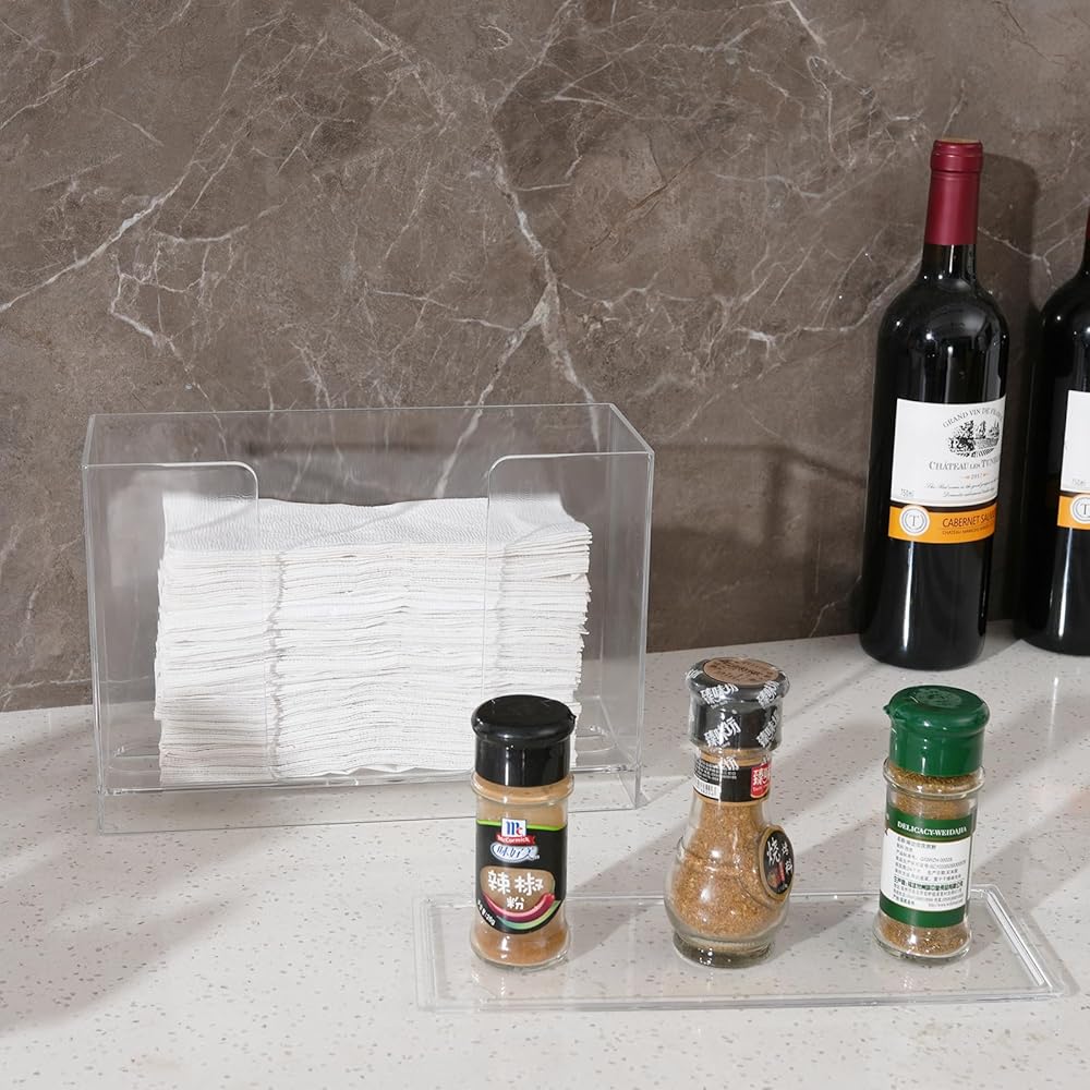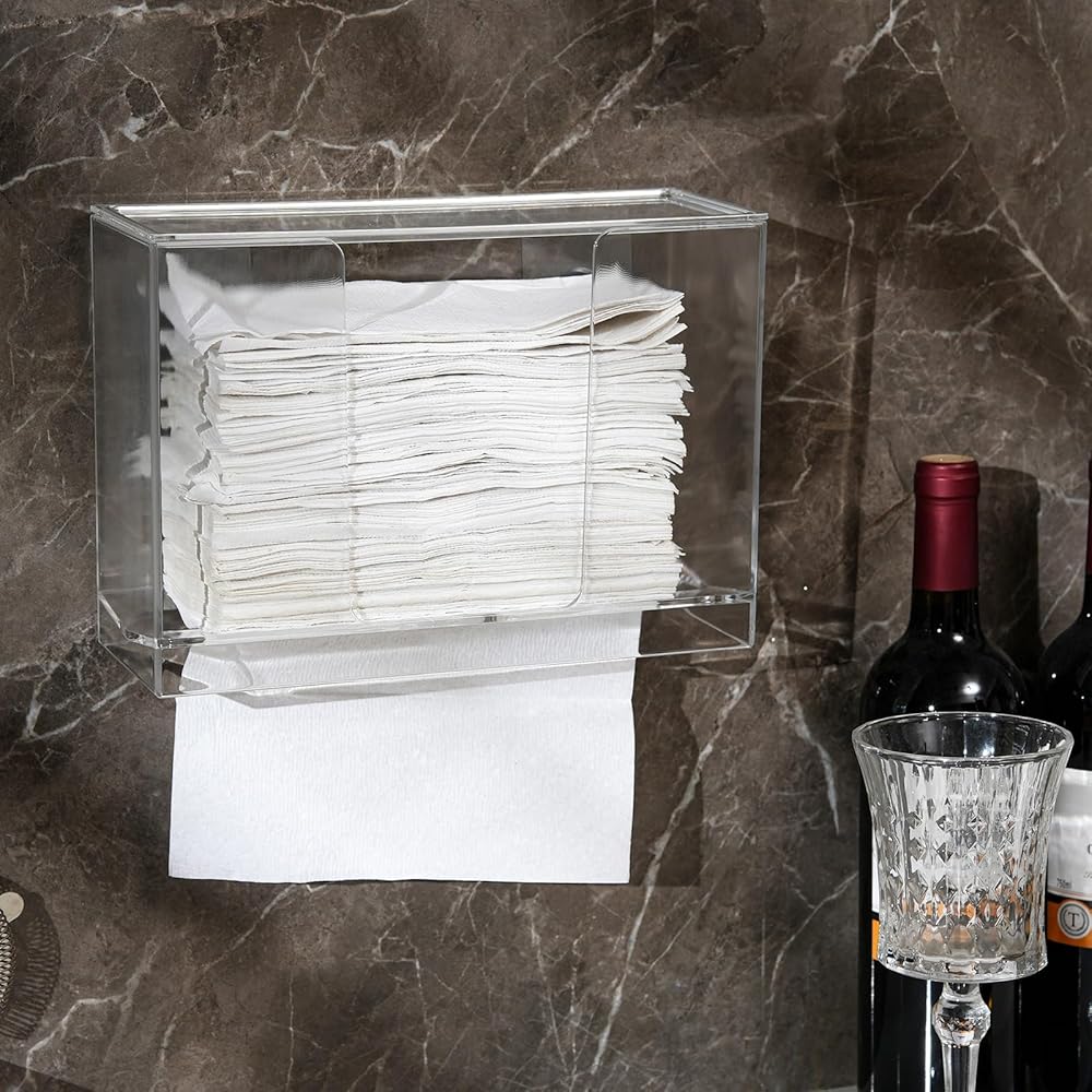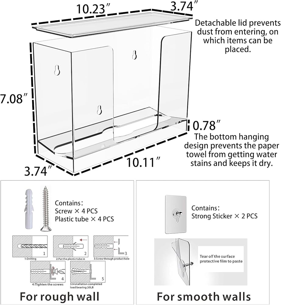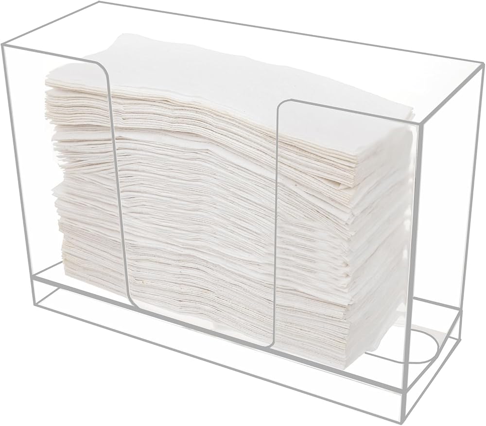 يتميز موزع المناشف الورقية من الأكريليك الشفاف بأبعاد إجمالية تبلغ 10.23 بوصة × 3.74 بوصة × 7.08 بوصة. مع غطاء قابل للإزالة مصمم يمكنه منع الغبار كما يمكن رؤيته على مستوى الورق بالداخل وإعادة تعبئته عند الضرورة.
