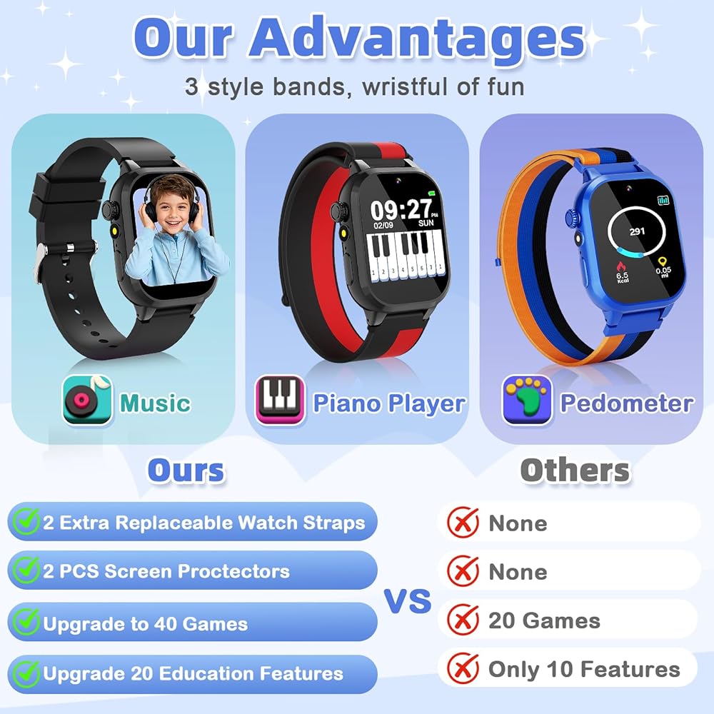 【40 لعبة】تحتوي ساعة الأطفال الذكية هذه على 40 لعبة — 36 لعبة ألغاز، و3 ألعاب رياضية، وأحدث لعبة للاعب البيانو. المزيد من الألعاب تجعلها ممتعة للأطفال من جميع الأعمار، مما يعزز تفكيرهم المنطقي والتنسيق بين اليد والعين. باستخدام أدوات الرقابة الأبوية، يمكنك بسهولة تعيين حدود وقت اللعب. تتميز ساعة الفتيات هذه أيضًا بمشغل موسيقى، وتدعم تنزيل ملفات MP3 حتى يتمكن الأطفال من الاستمتاع بأغانيهم المفضلة في أي وقت