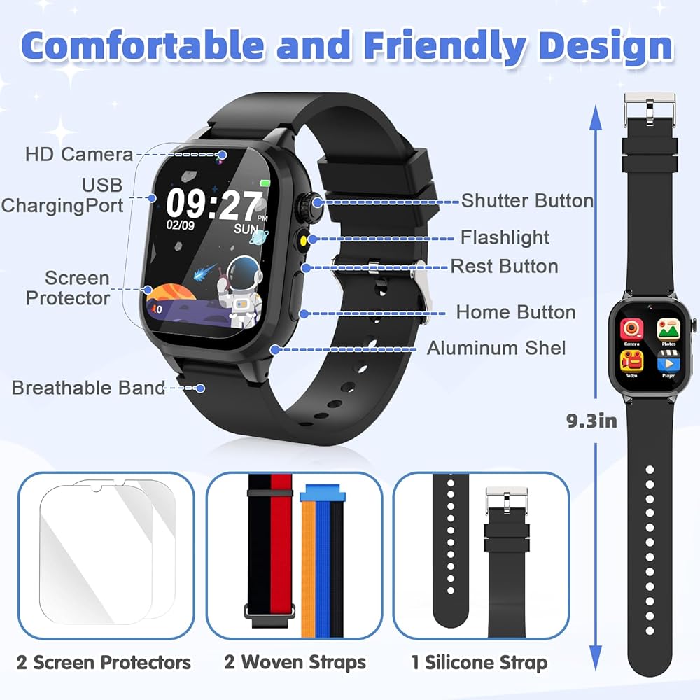 【ساعة للأطفال مع 3 أنماط للسوار】ساعة الأطفال الذكية مزودة بواقي شاشة للحماية من الاصطدامات والسقوط. تتضمن 3 أنماط للأحزمة: 1 سيليكون و2 منسوج، لتناسب الأنماط وسيناريوهات الاستخدام المختلفة. إنها تحتوي على شريط فيلكرو قابل للتعديل، مما يجعل من السهل تعديله لضمان الملاءمة. تُعد ساعة الألعاب الترقية هذه هدية رائعة للأولاد والبنات الذين تتراوح أعمارهم بين 4 و12 عامًا