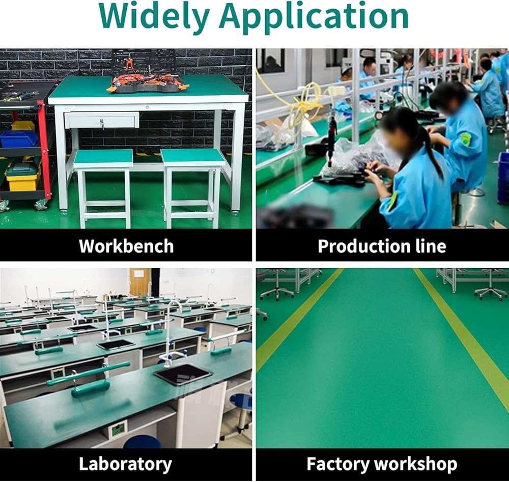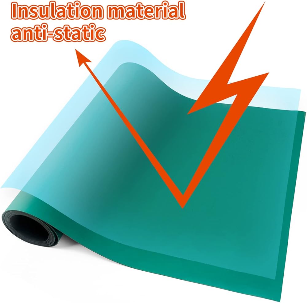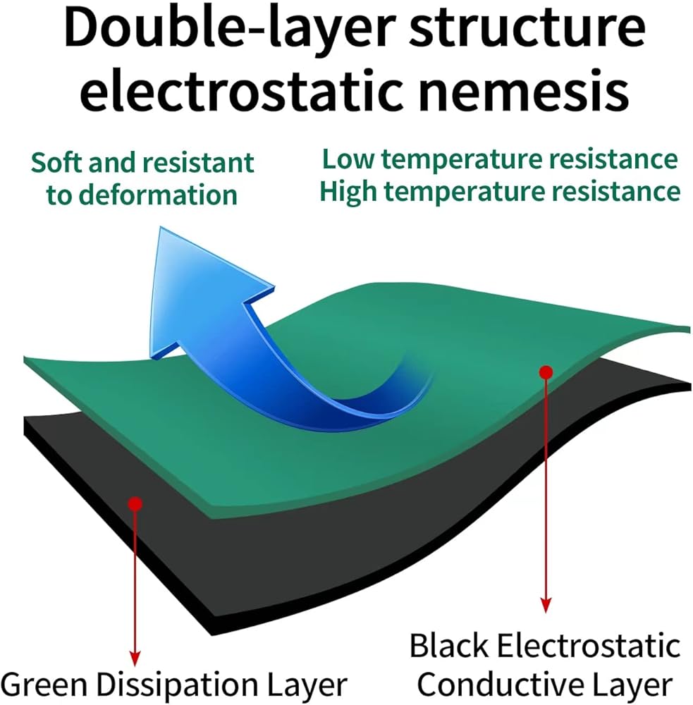 ⚡【طبقة مزدوجة】: يحتوي منتجنا على طبقة علوية مصنوعة من مطاط تبديد ثابت وطبقة سفلية مصنوعة من مطاط موصل أسود، يتحمل درجات الحرارة العالية، وتشوه مكواة اللحام، والمذيبات، والتدفق، والمواد الكيميائية القاسية الأخرى، مقاوم للتآكل وسهل الاستخدام. ينظف.