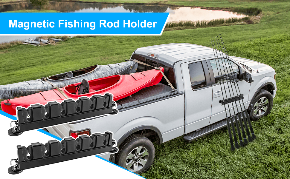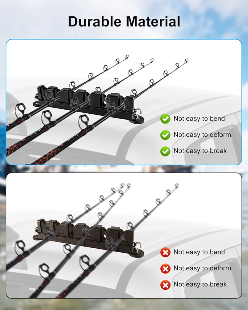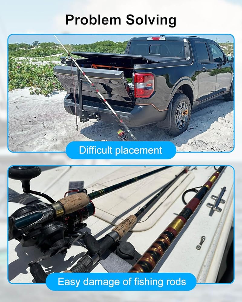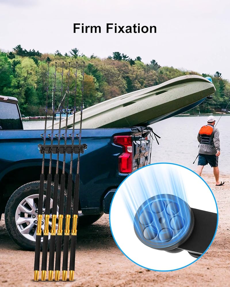 نظام القفل المزدوج: يتميز رف عمود الصيد بقاعدة مغناطيسية معززة بالإضافة إلى قفل حبل مرن قابل للتعديل، ونظام القفل المزدوج يحافظ على القضبان ثابتة في مكانها، حتى على الطرق الوعرة أو أثناء النقل.