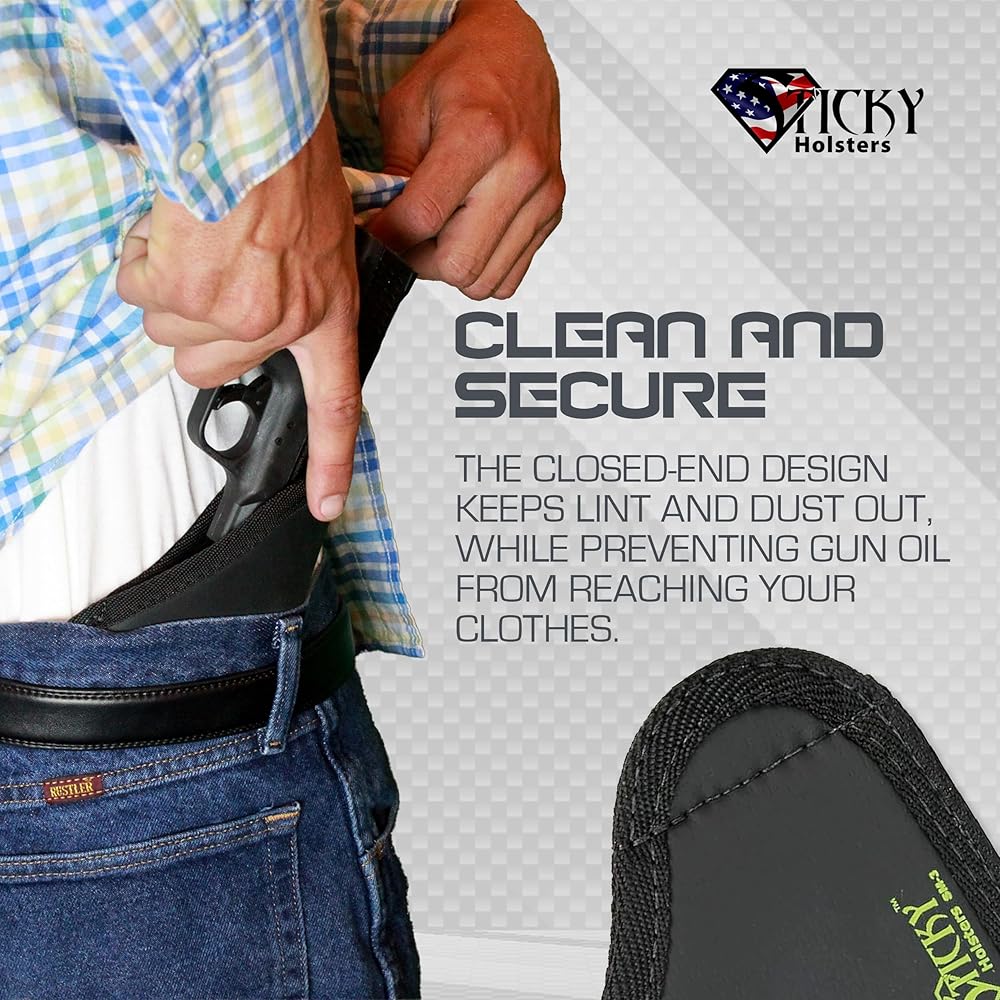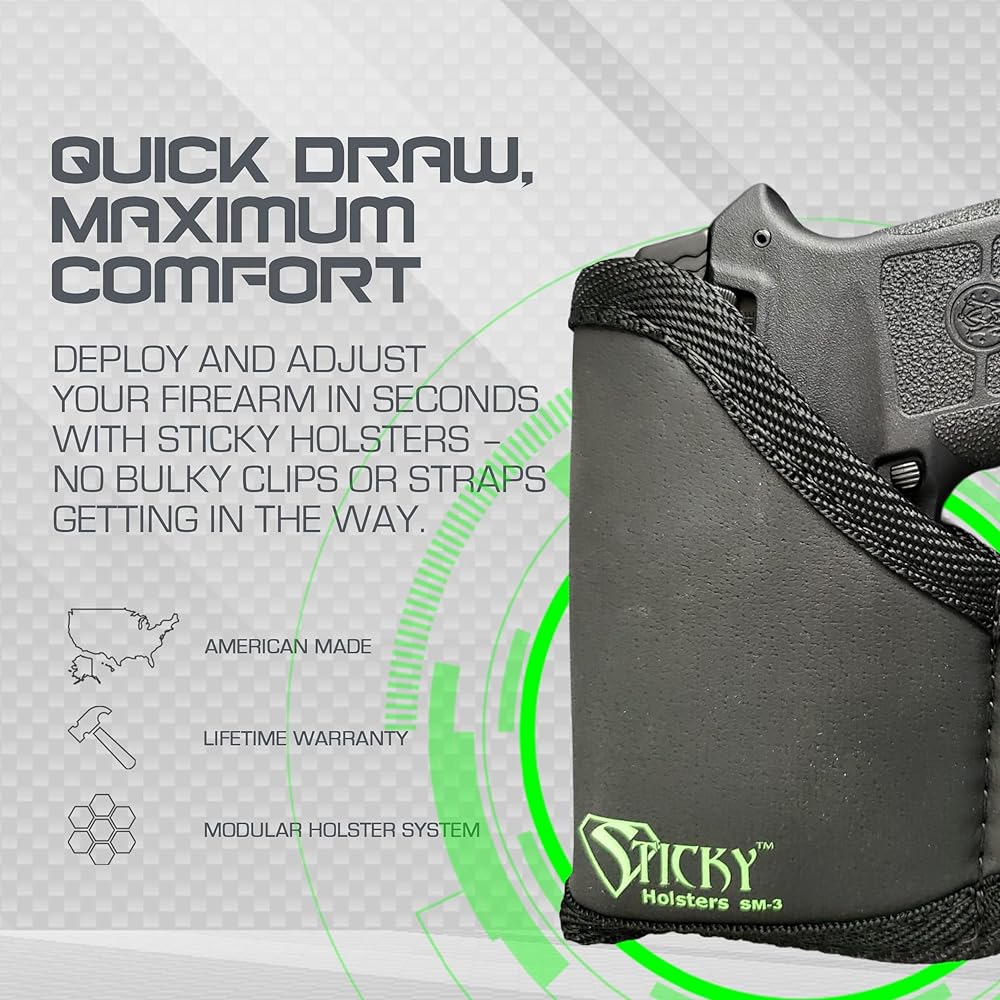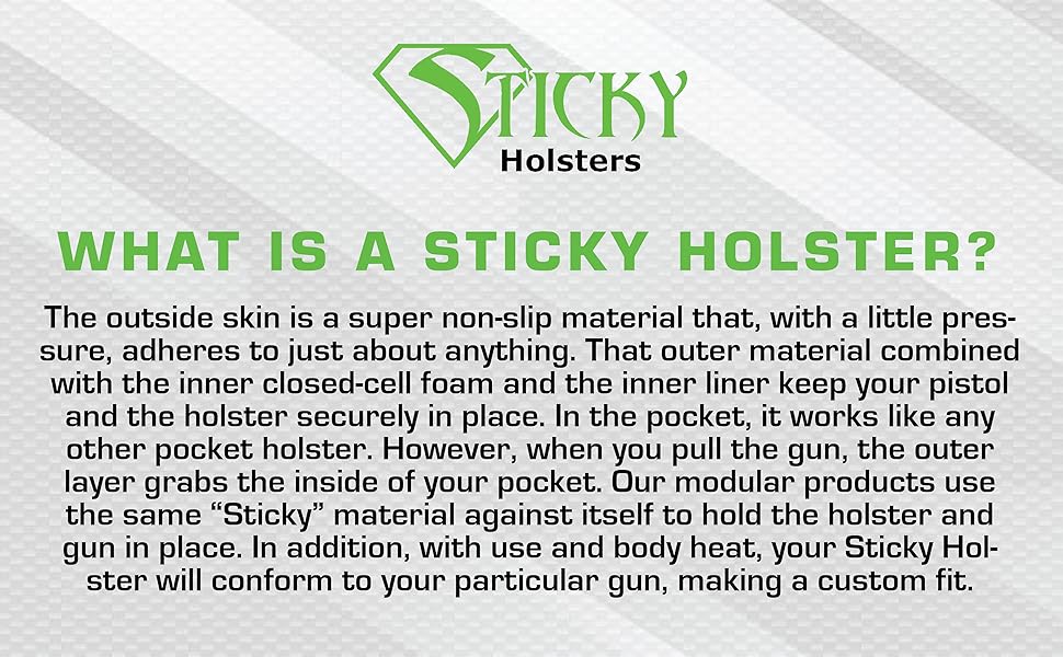 • توفر حافظة إخفاء المسدسات Sticky Holsters الحل الأمثل لحمل سلاحك الجانبي بشكل سري، سواء داخل حزام الخصر أو في جيوبك. يتيح لك تصميمه الفريد حمل مسدسك دون عناء في مجموعة متنوعة من الملابس مثل السراويل الرياضية أو سراويل اليوغا أو الجينز أو أي ملابس تقريبًا، مع الحد الأدنى من الطباعة وعدم وجود شعور كبير الحجم.