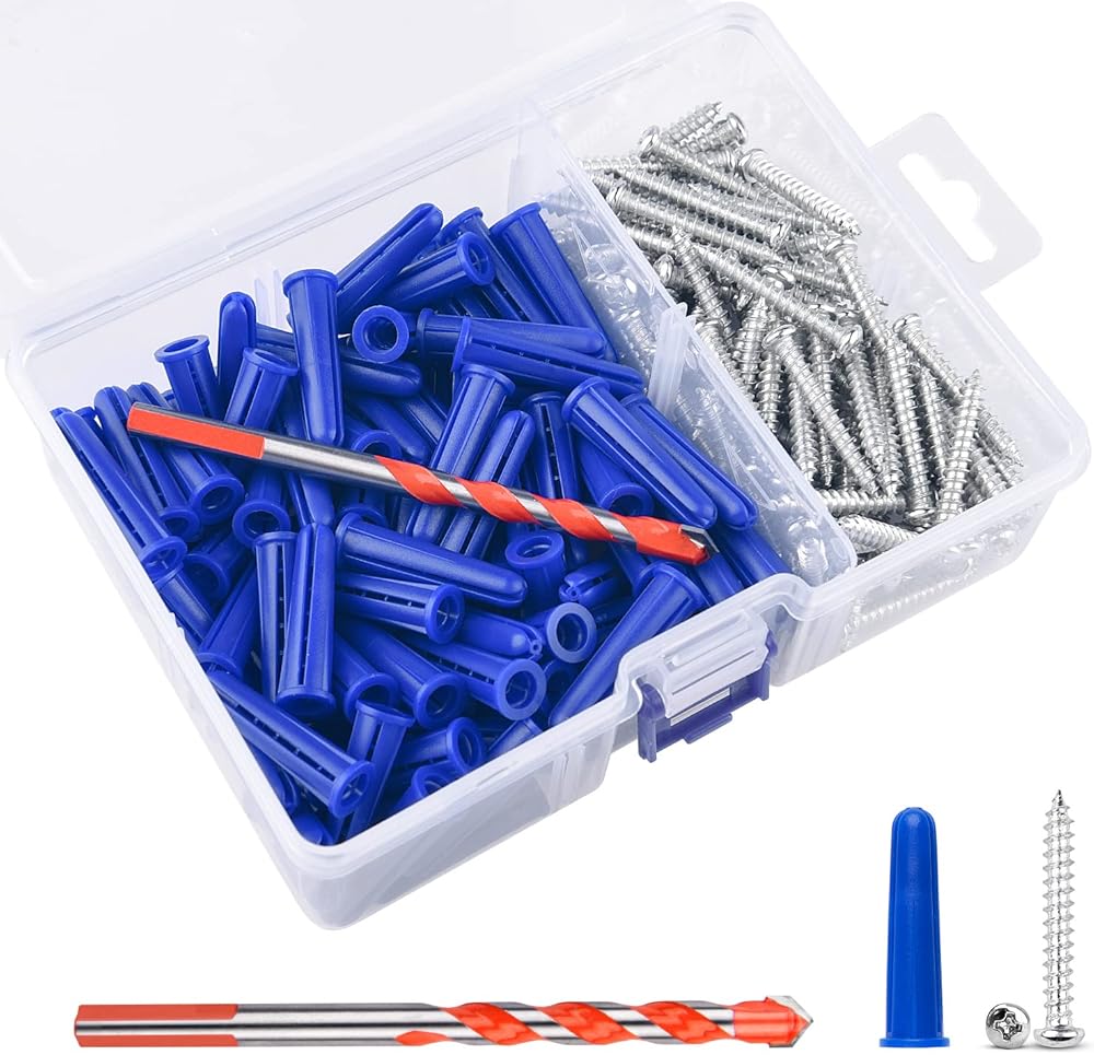 مجموعة المراسي والمسامير الخرسانية، 100 قطعة من مثبتات البناء و100 قطعة من براغي البناء مع قطعة واحدة من اللقمة المقابلة، ومراسي مخروطية زرقاء ومسامير ذاتية اللولبة لجدار الطوب الخرساني الجص