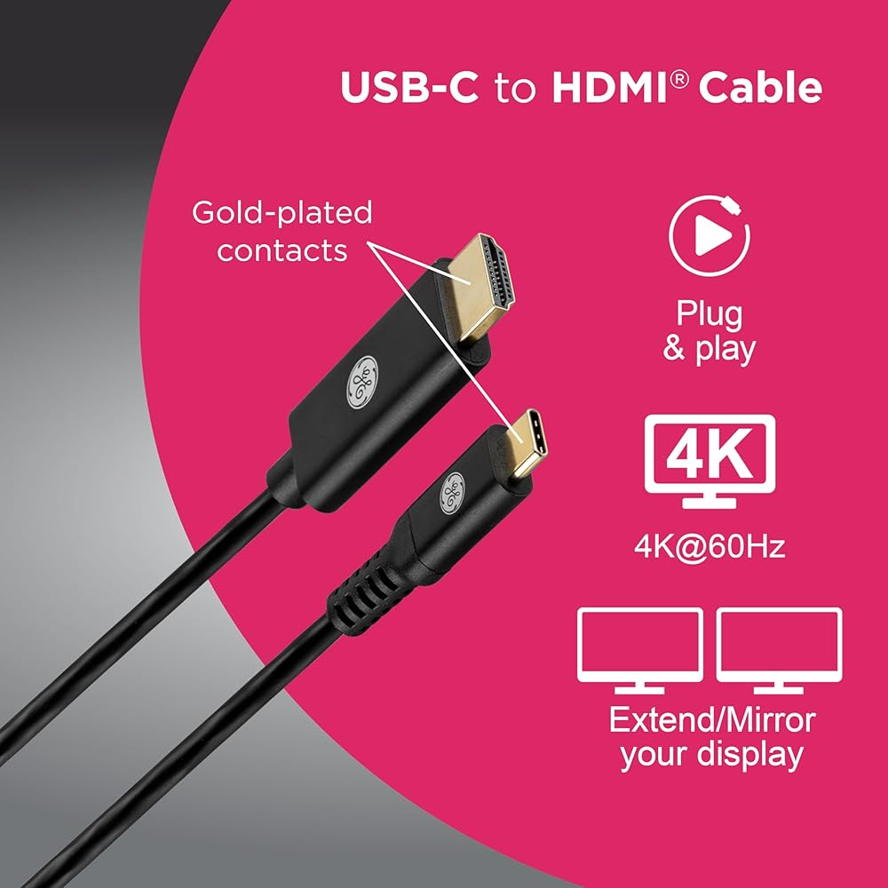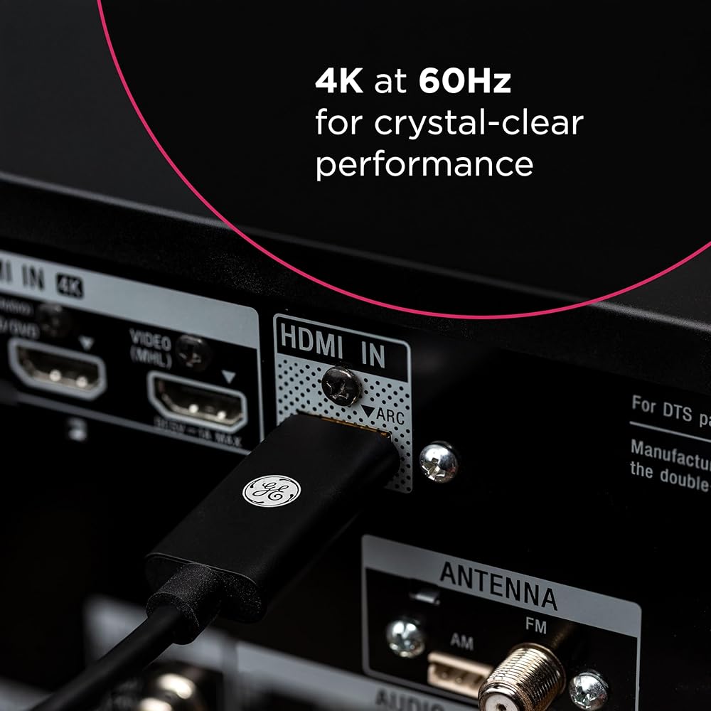 Immerse yourself in a superior HDTV viewing or gaming experience with a GE-branded UltraPro Premium Certified 8K Ultra High-Speed HDMI 2.1 Cable with Ethernet. Its increased Dynamic HDR capability supports up to 60 frames per second, delivering a bright, clear picture with richer, more vibrant colors designed for enhanced streaming, real-time gaming, 3D movies, virtual reality and more. With built-in Ethernet and the ability to transfer data up to 48Gbps, this HDMI cable is future-ready for enhanced audio, video and gaming up to 10K. This high-performance cable features maximum shielding to minimize electromagnetic interference as well as boost data transfer. Its durable nylon braided jacket is resistant to stiffening and damage, and its gold-plated contacts and premium metallized finish on the cable heads provide the most secure connection. This black 1.5ft. cable is perfect for compact setups, and the plug-and-play installation is effortless. Maximize your home entertainment system with a GE-branded UltraPro Premium Certified 8K Ultra High-Speed HDMI 2.1 Cable with Ethernet.