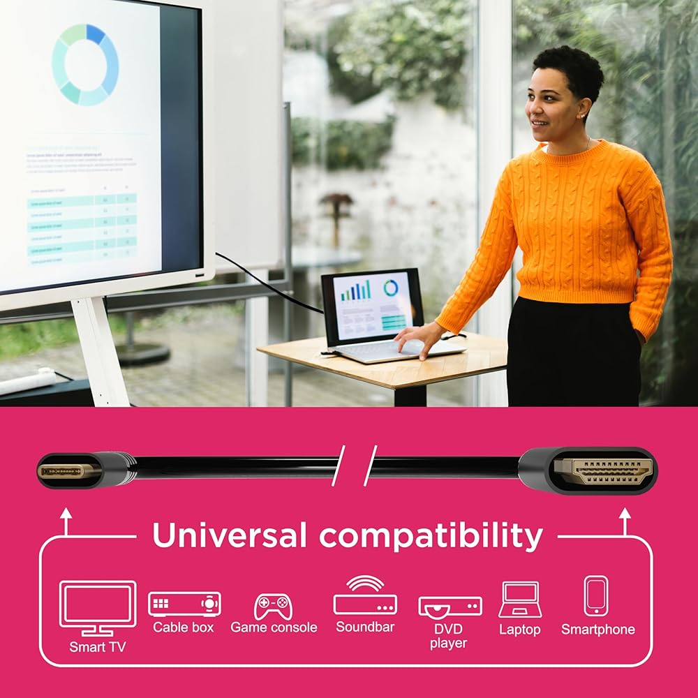 Future-proof – HDMI 2.1; supports data transfer up to 48Gbps, 8K@60Hz fps, 4K@120Hz fps, HDCP 2.2 (with compatible source), eArc, Dolby Atmos and HD Dolby 7.1 audio; perfect for next-level gaming systems and extreme AV installations