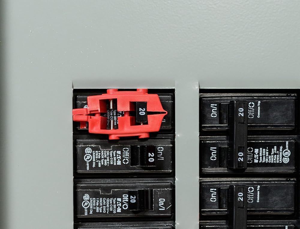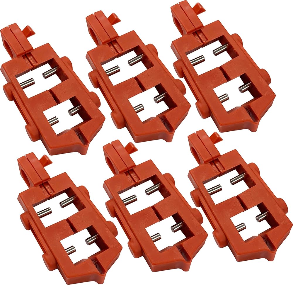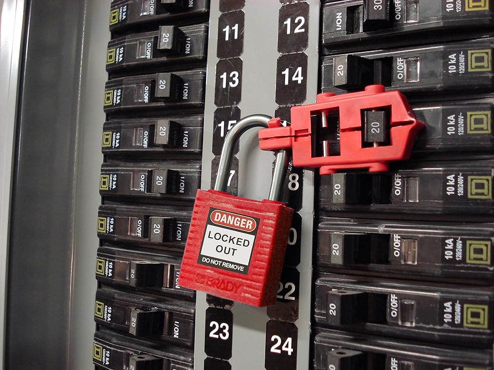 Designed for 120V circuit breakers with holes in the switch tab. Quick and simple, all you have to do is click the device into its housing and secure the lock. Double cavities to accommodate different sizes of switch tabs. Dimensions - Width (mm): 30.23 mm. Dimensions - Height (mm): 54.36 mm. Dimensions - Thickness (mm): 8.38 mm. Size - W x H x D (mm): 30.23 x 54.36 x 8.38. Max.diameter padlock height (mm): 7.16 mm. Minimum shackle spacing: 12.70 mm. Dimensions: 30.23mm W x 54.36mm H x 8.38mm D. Material Features: Material: Nylon. Material Type: Nylon. Red color. Operating temperature ° C: 120 ° C. Minimum operating temperature ° C: -20 ° C. Adhesive (Y / N): No. Product features: Max. of padlocks attached: 1. Risk: Electrical risk. Voltage: 120 V.