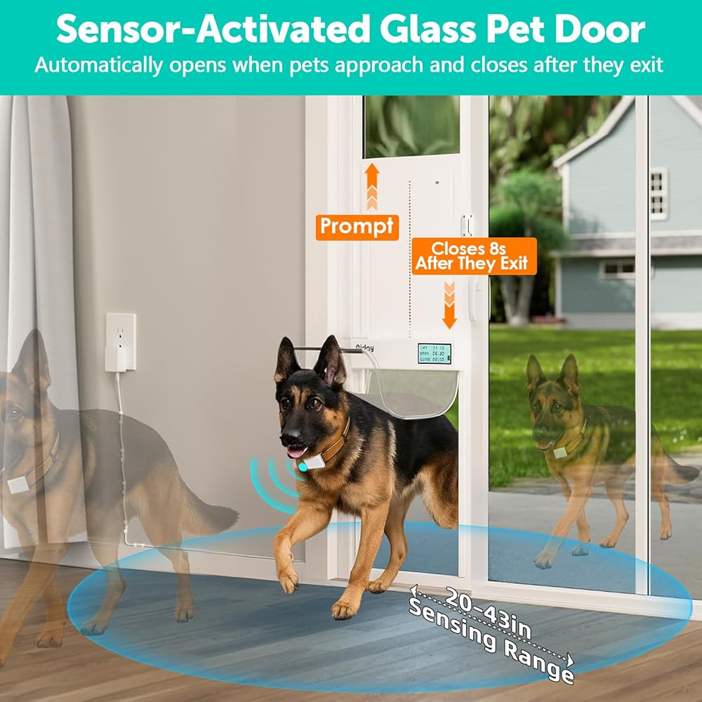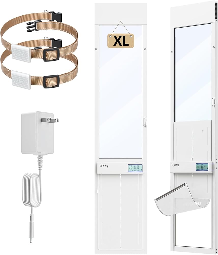 باب زجاجي منزلق أوتوماتيكي للكلاب: يأتي باب الكلب الكهربائي Aiday Xlarge مزودًا بطوقين مستشعرين حصريين - فقط حيوانك الأليف هو الذي يطلق الدخول (لا يوجد شارد أو قطط أو راكون). يتم فتحه تلقائيًا عندما يقترب الجرو الخاص بك (بدون دفع!) ويغلق بإحكام بعد 8 ثوانٍ. زر واحد يضبط نطاق الاستشعار (20-28 بوصة أو 35-43 بوصة). براءة اختراع في انتظار.
