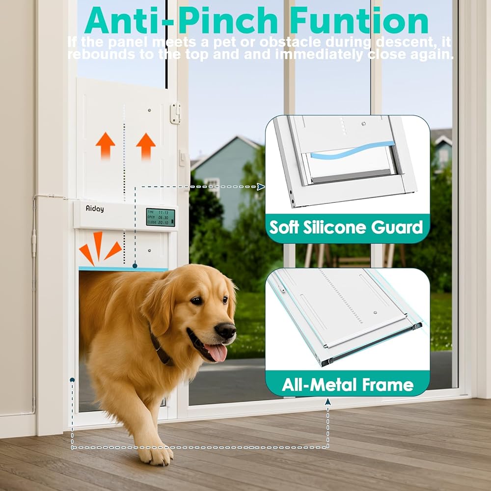 حماية ضد القرص: يحتوي باب الكلب الزجاجي المنزلق Aiday Xlarge على غطاء لسهولة الدخول/الخروج، بالإضافة إلى ميزة مدمجة مضادة للقرص: إذا بقي حيوانك الأليف في منتصف الممر، فإن الباب يتوقف على الفور وينعكس لحماية الكفوف والذيول.