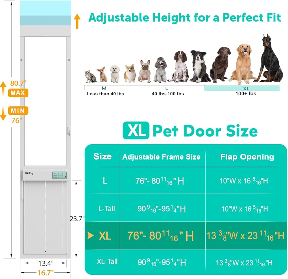 باب زجاجي منزلق أوتوماتيكي للكلاب مع مستشعر للياقة، باب هزلي كهربائي كبير جدًا لأبواب زجاجية منزلقة، ارتفاع منزلق قابل للتعديل من 76 بوصة إلى 80-11/16 بوصة، مضاد للقرص، يناسب الكلاب الكبيرة جدًا حتى 220 رطلاً (XL)