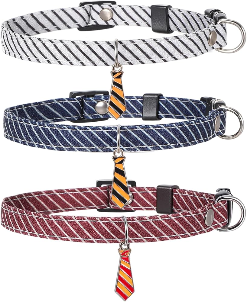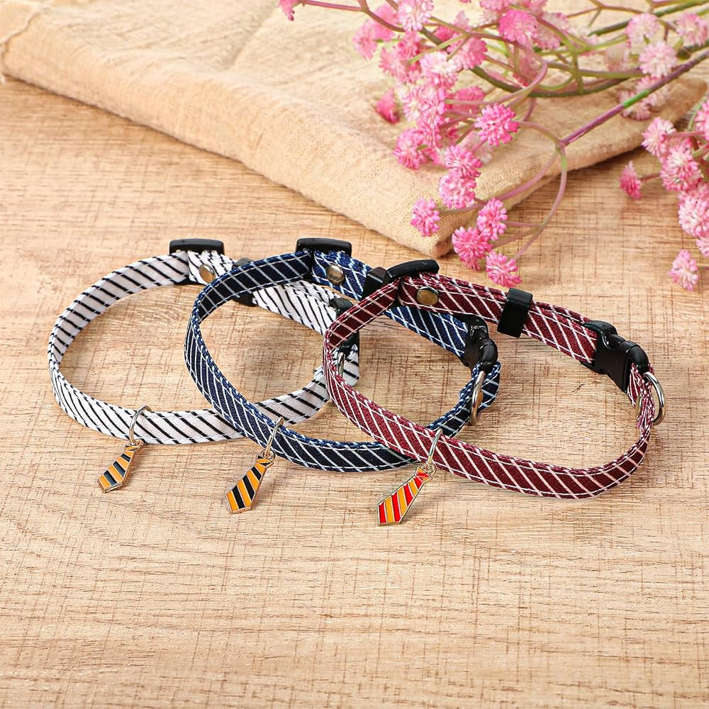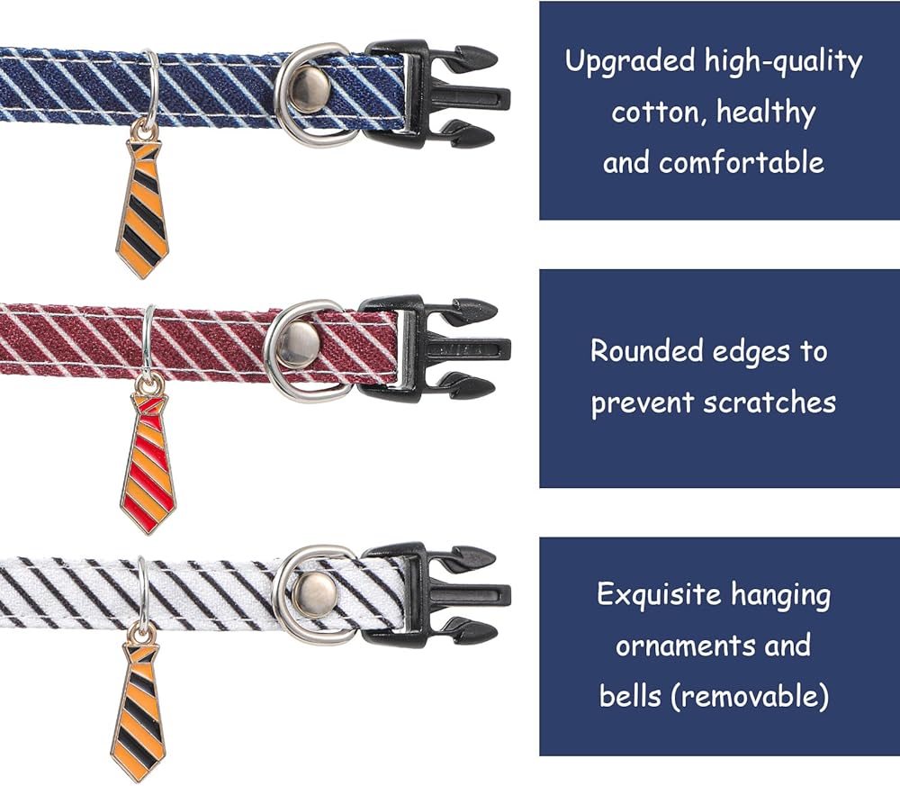 Each package contains three different colored striped cat collars (red, blue, white), each with tie decoration.