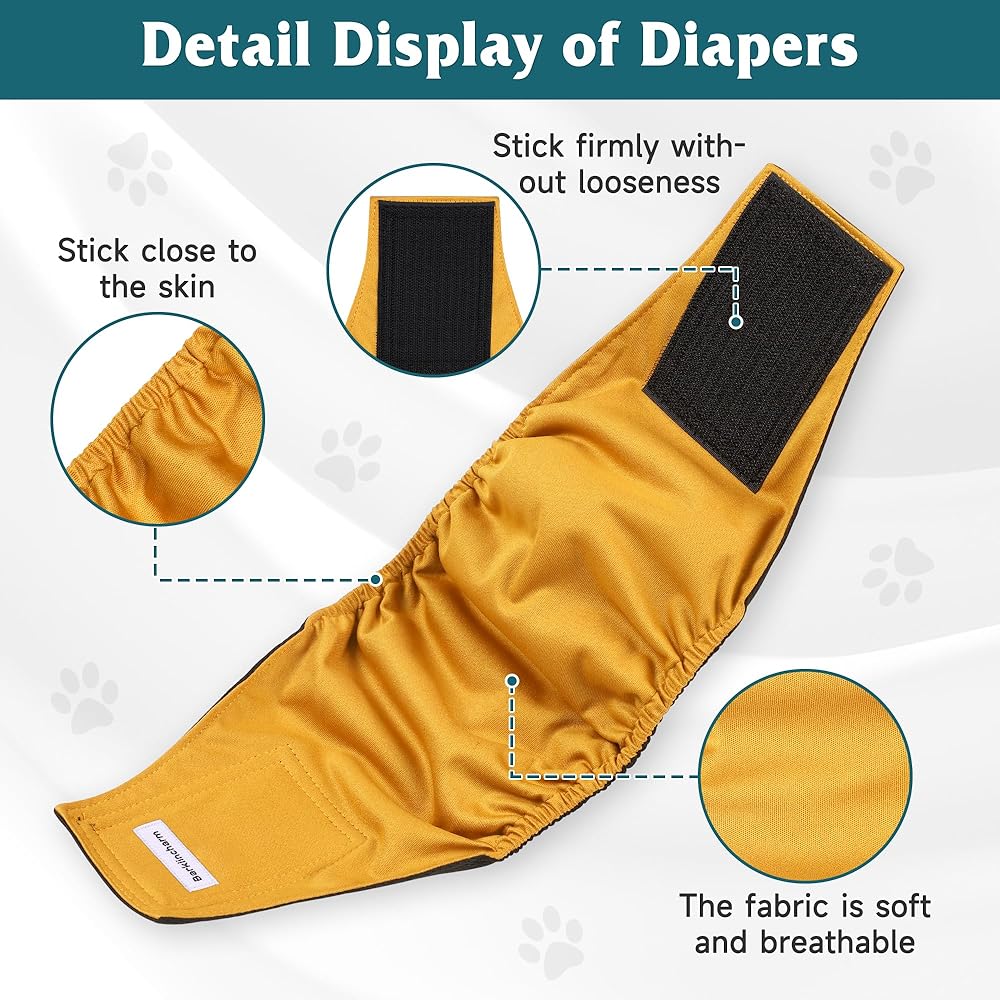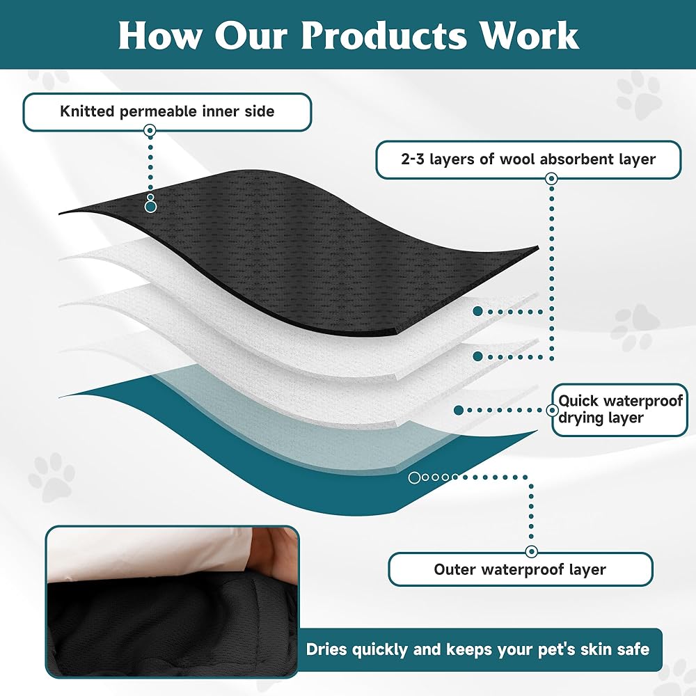 عالية الامتصاص ولا تسرب: حفاضات الكلاب لدينا متعددة الطبقات، مع طبقة عالية الامتصاص تمتص السوائل بشكل فعال وطبقة خارجية عازلة للماء تمنع انسكاب السوائل وتحمي الأرضيات والسجاد والأثاث. يطرد الجزء الداخلي من الجيرسيه الناعم الرطوبة ويحافظ على جفاف كلبك أثناء الاستخدام لفترة طويلة