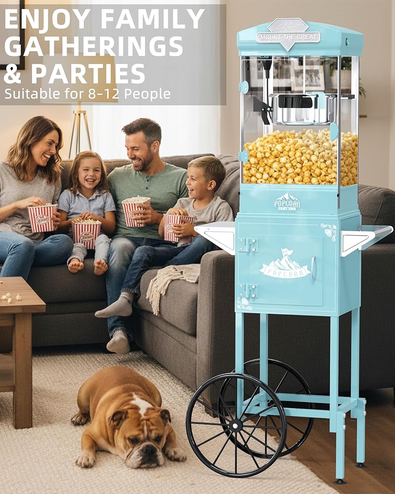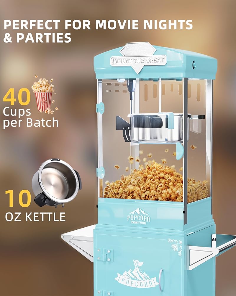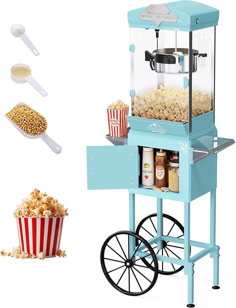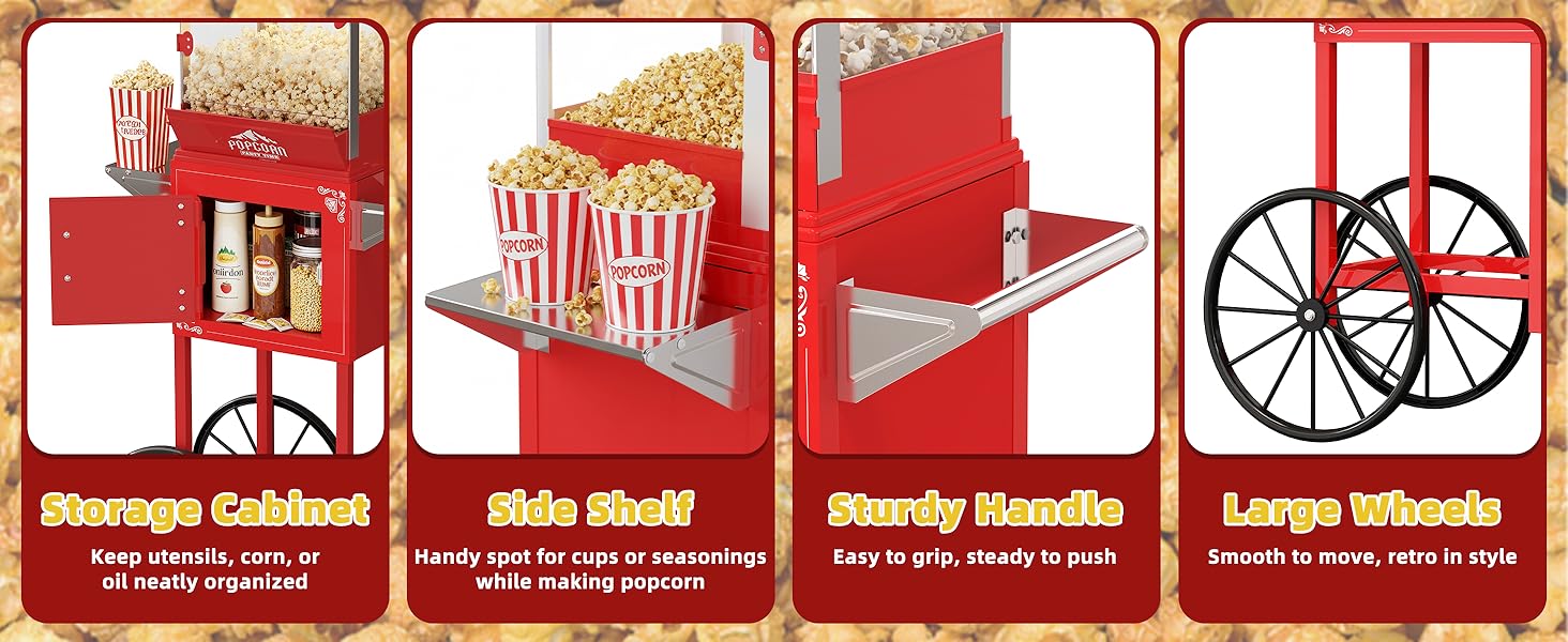 مساحة تخزين مدمجة ومساحة عمل واسعة: تم تصميم هذا الطراز كآلة فشار على الطراز العتيق مع عربة، ويشتمل هذا الطراز على خزانة تخزين كبيرة ومنطقة سطح عمل للحفاظ على أكياس الفشار والتوابل والمجارف منظمة. سواء كنت تستخدمه كصانع فشار منزلي أو آلة فشار تجارية، يبقى كل شيء في متناول اليد للحصول على تجربة فرقعة سلسة وفعالة.