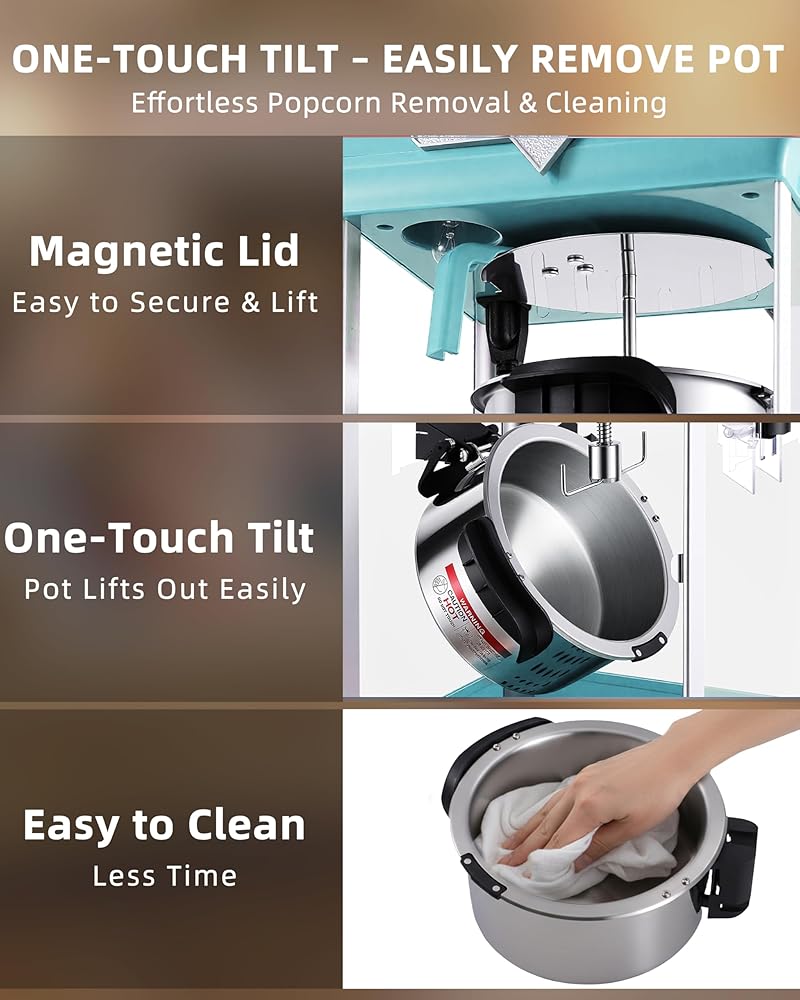تصميم غلاية فريد من نوعه وسهل الصب: تتميز غلاية الفولاذ المقاوم للصدأ سعة 10 أونصة الموجودة في ماكينة صنع الذرة الفشار بنظام إمالة بلمسة واحدة وغطاء مغناطيسي من أجل صب آمن وسهل. يمنع واقي الرش المدمج التدفق الزائد ويفتح البخار للحفاظ على الفشار مقرمشًا. من السهل تنظيف الغلاية القابلة للفصل بقطعة قماش مبللة، بحيث تقضي وقتًا أقل في التنظيف ووقتًا أطول للاستمتاع بالحلويات الطازجة.