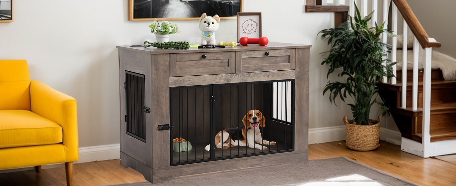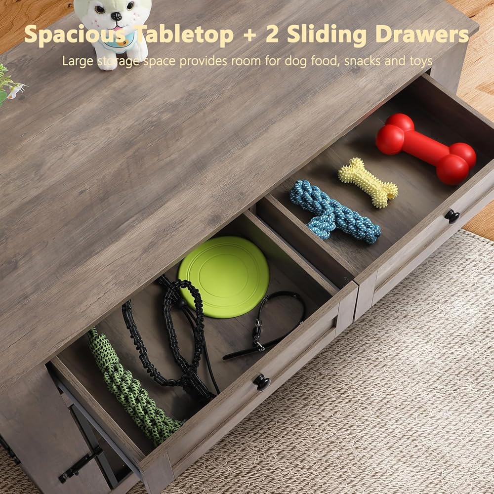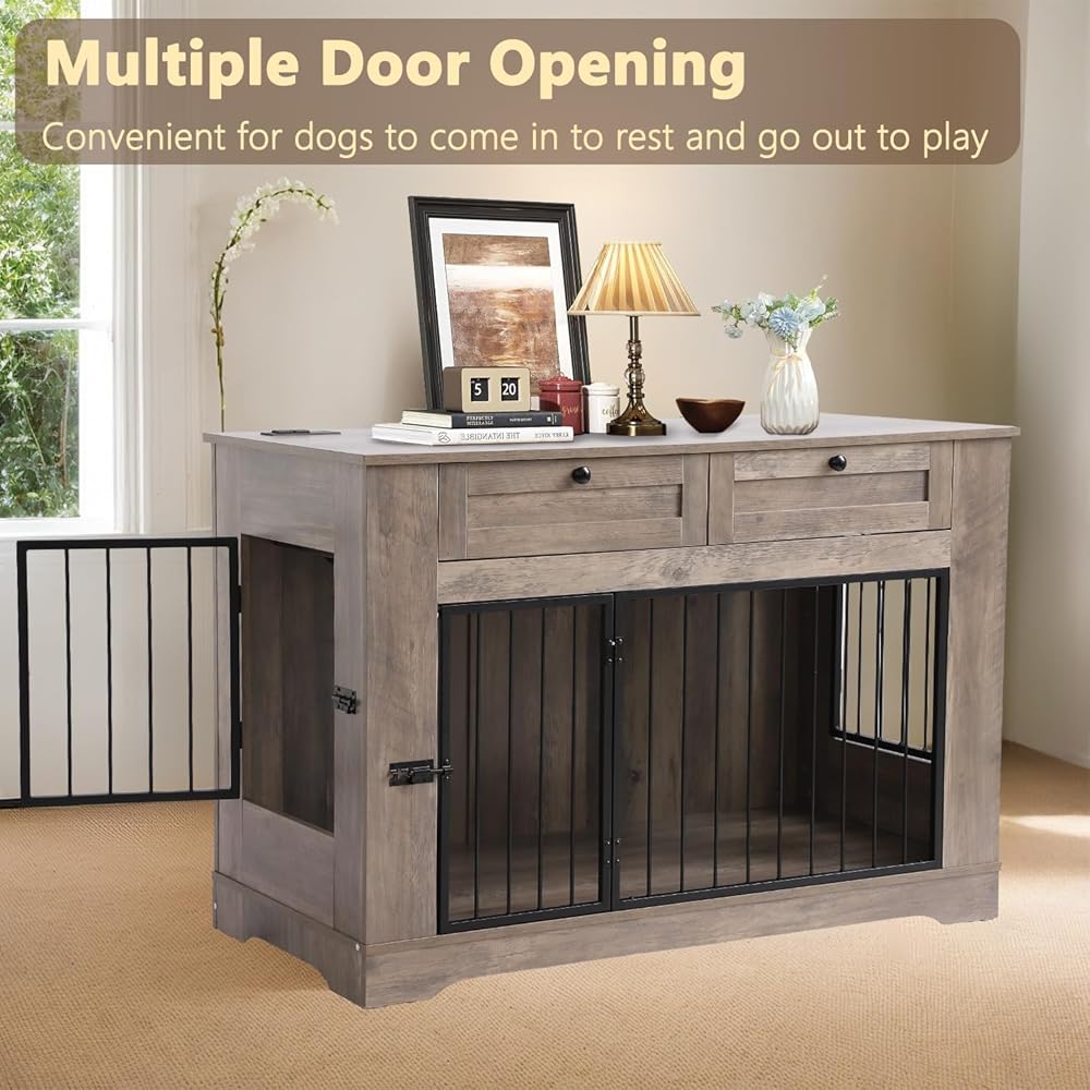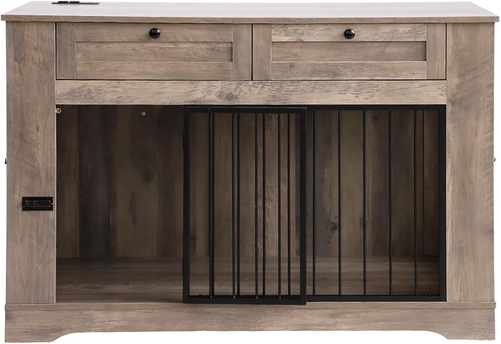Large Dog Crate Furniture-Decorative Heavy Duty Dog Cage Indoor, Wooden Dog Cage End Table with Charging Station, Dog House with 2 Drawers (Gray, 70.86''L)