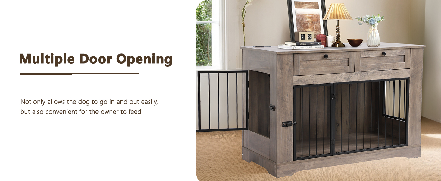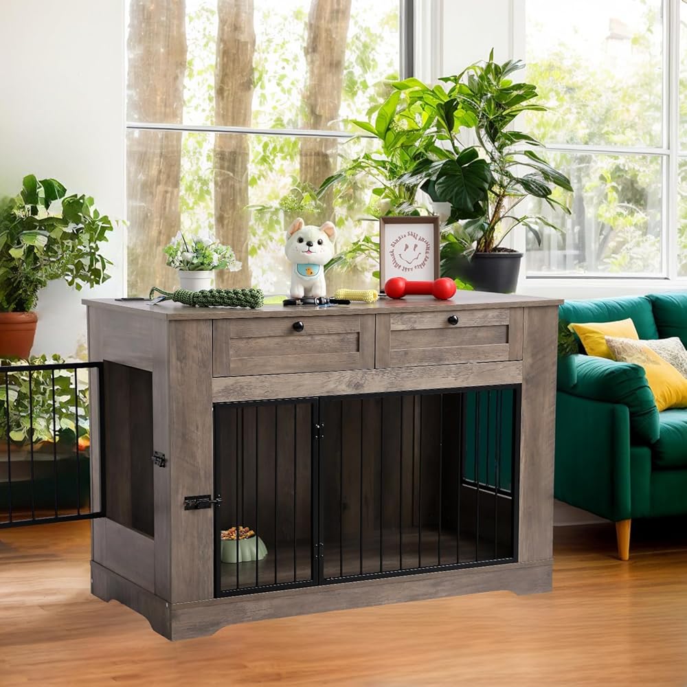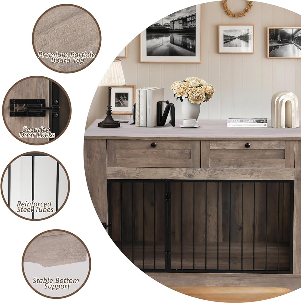 Large Dog Crate Furniture-Decorative Heavy Duty Dog Cage Indoor, Wooden Dog Cage End Table with Charging Station, Dog House with 2 Drawers (Gray, 70.86''L)