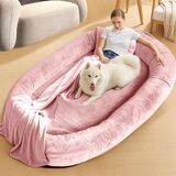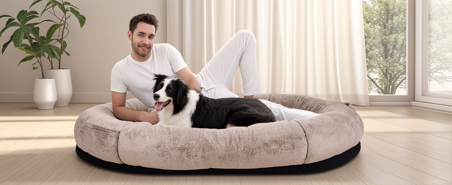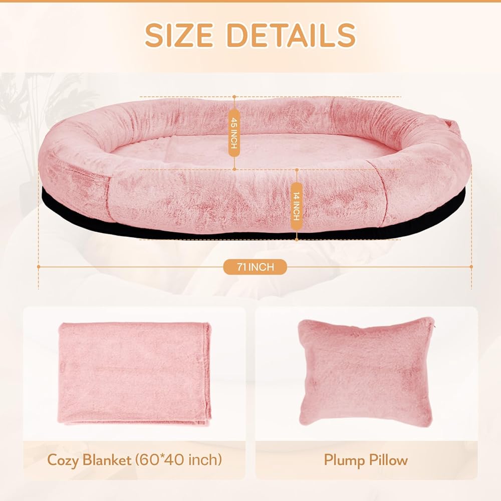 【راحة فاخرة】تم تصنيع سرير الكلاب العملاق هذا للبشر من نسيج الفرو الصناعي الفاخر، مما يعطي ملمسًا ناعمًا لطيفًا وصديقًا للبشرة وجيد التهوية بما فيه الكفاية. يأتي مع بطانية ناعمة ووسادة يمكن استخدامها كسرير وفراش للكلاب، مما يوفر الدفء والحماية ضد البرد لك ولحيوانك الأليف المحبوب.