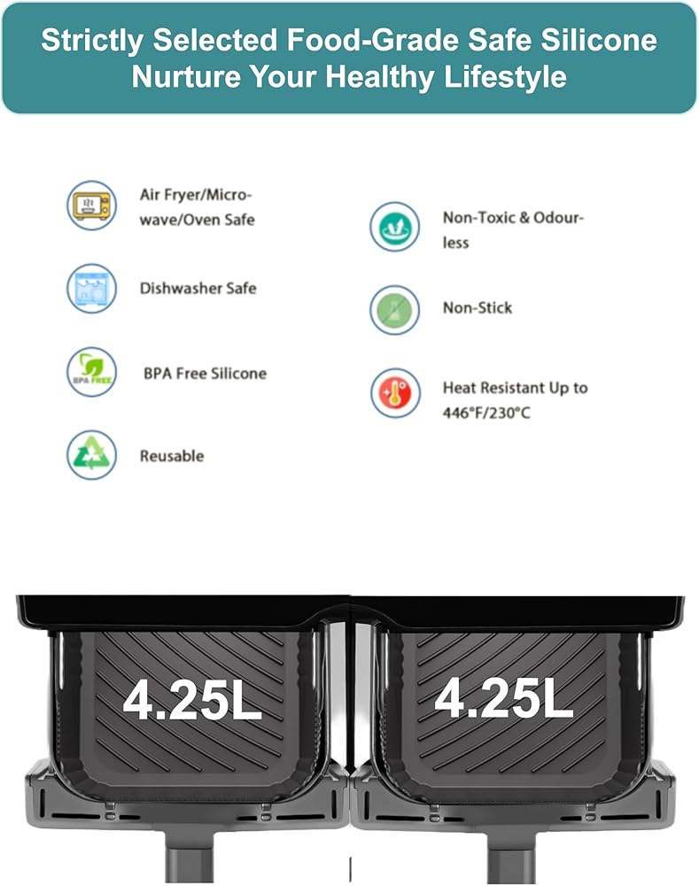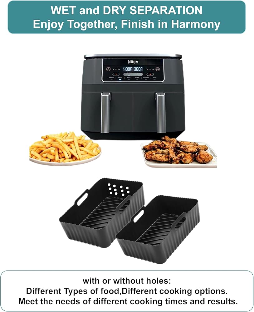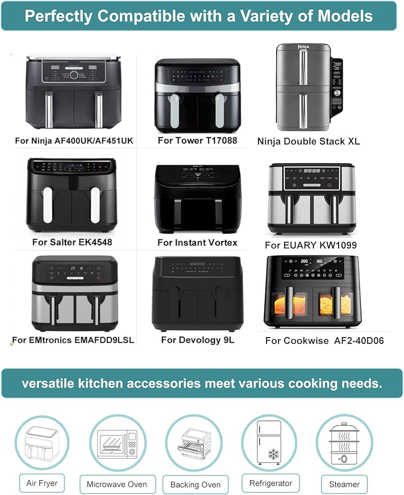 مناسب تمامًا لمقلاة Ninja Foodi DZ201 - مصممة خصيصًا لمقلاة الهواء Ninja Foodi DZ201 8QT DualZone Basket. مقاس 20 × 14 × 7 سم يناسب أيضًا Ninja DZ401، DZ550، DZ302، AF300، AF400، ومعظم مقالي الهواء ذات السلة المزدوجة 8-10QT.