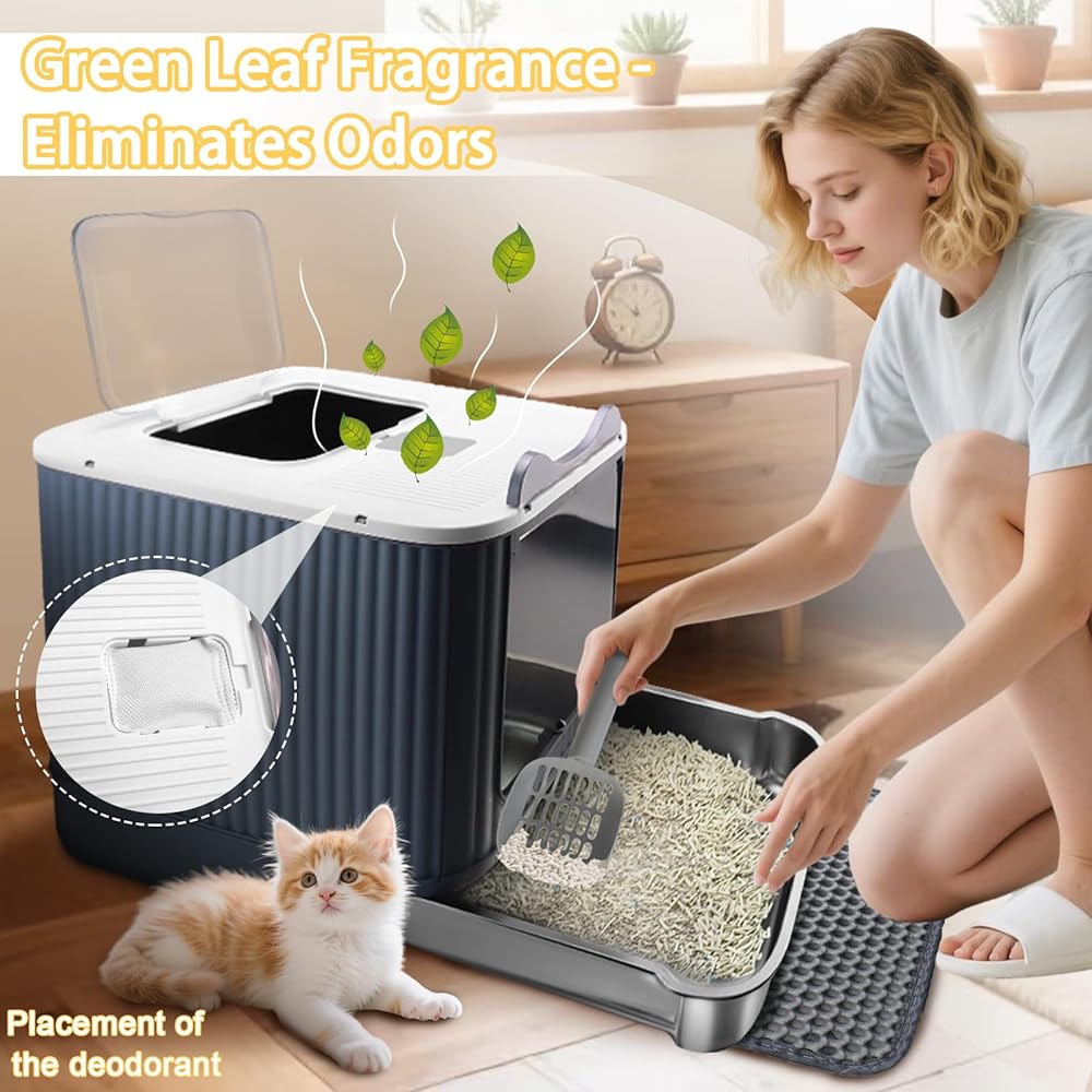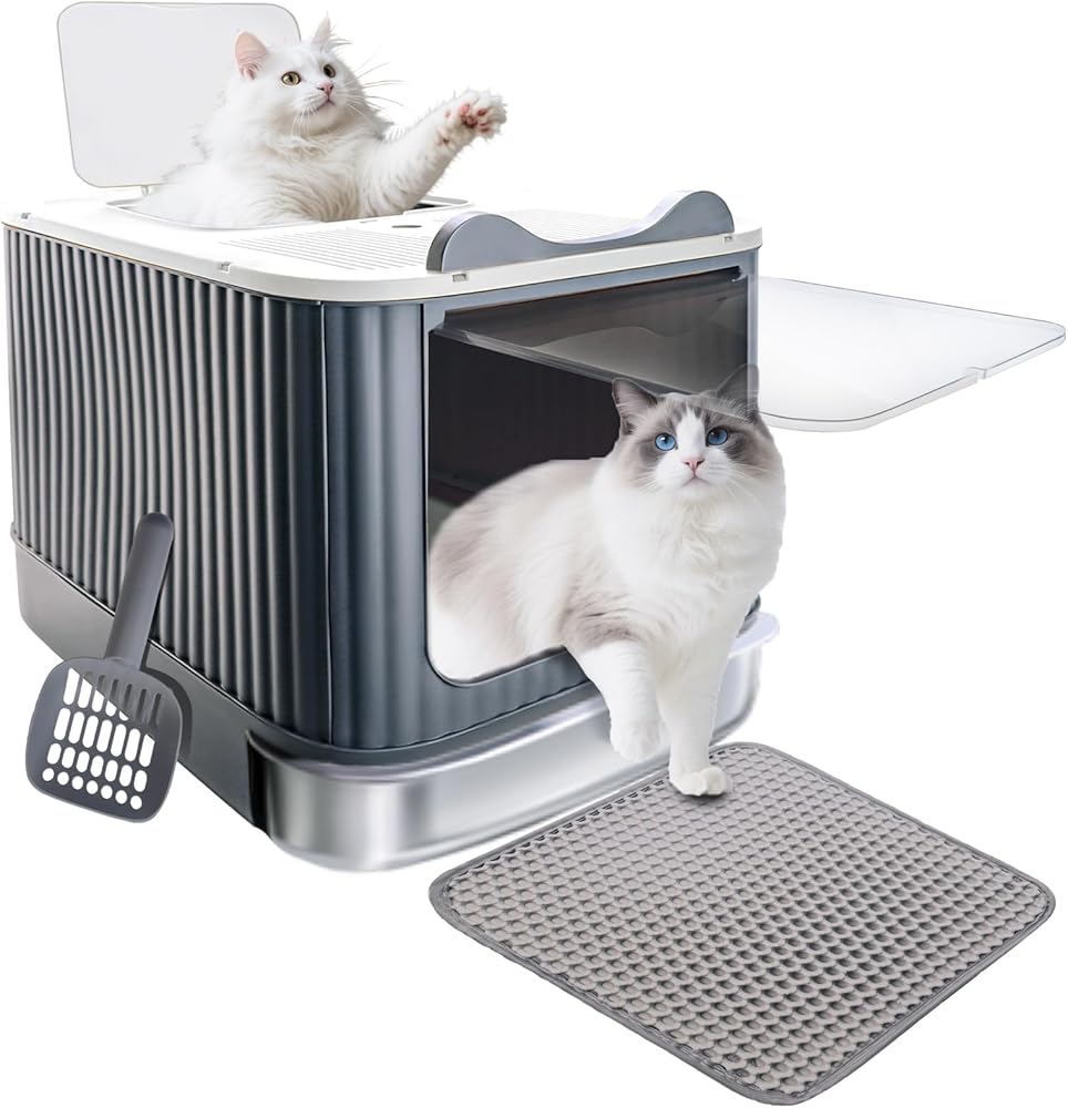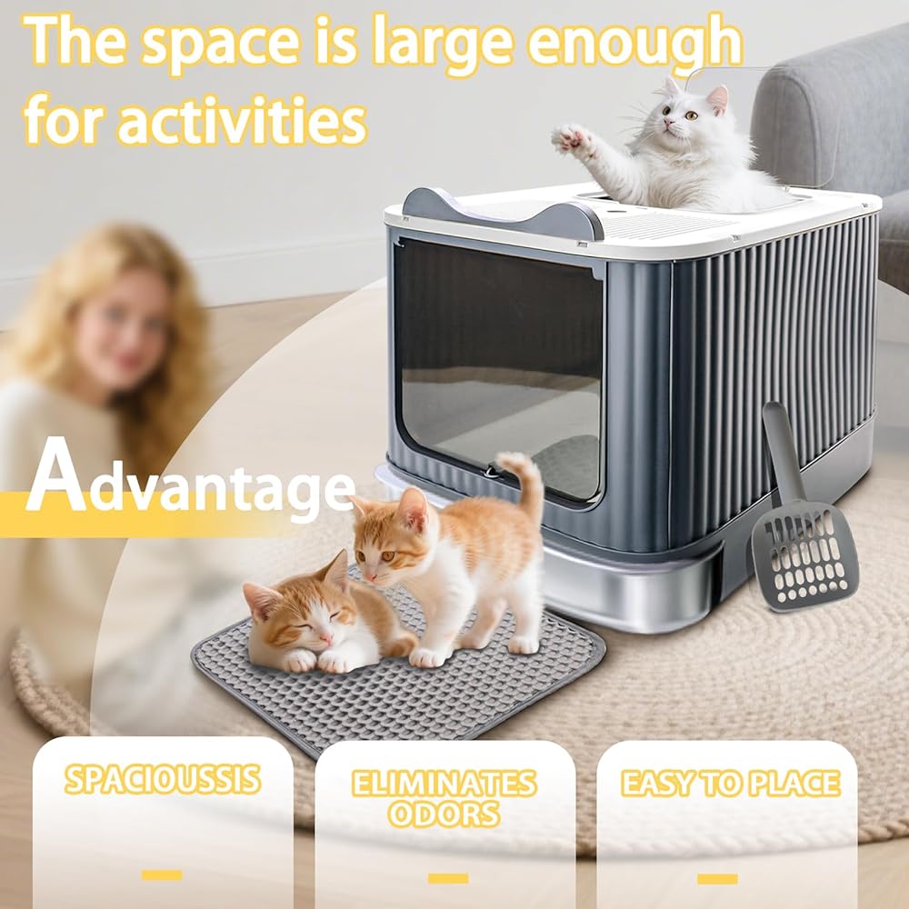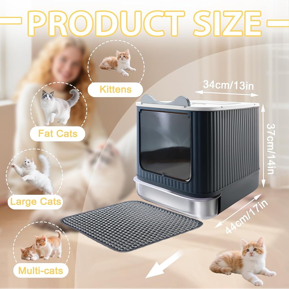 【مساحة داخلية واسعة لراحة القطط】 - يبلغ قياس صندوق الفضلات 43.18 سم طولًا × 35.56 سم عرضًا × 33.02 سم ارتفاعًا، ويوفر مساحة داخلية كبيرة تسمح للقطط بالدخول والالتفاف والخروج بشكل مريح. تساعد المساحة الواسعة على التحكم في الروائح والحفاظ على منزلك منتعشًا.