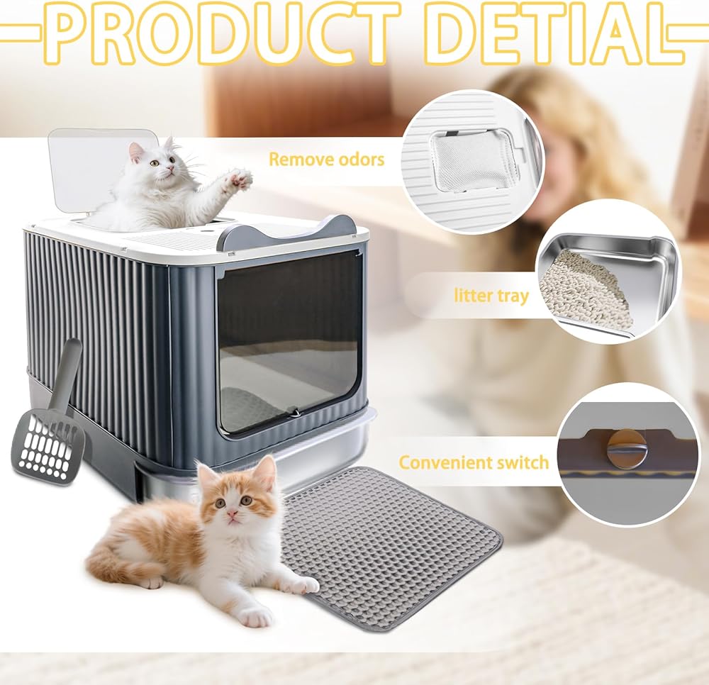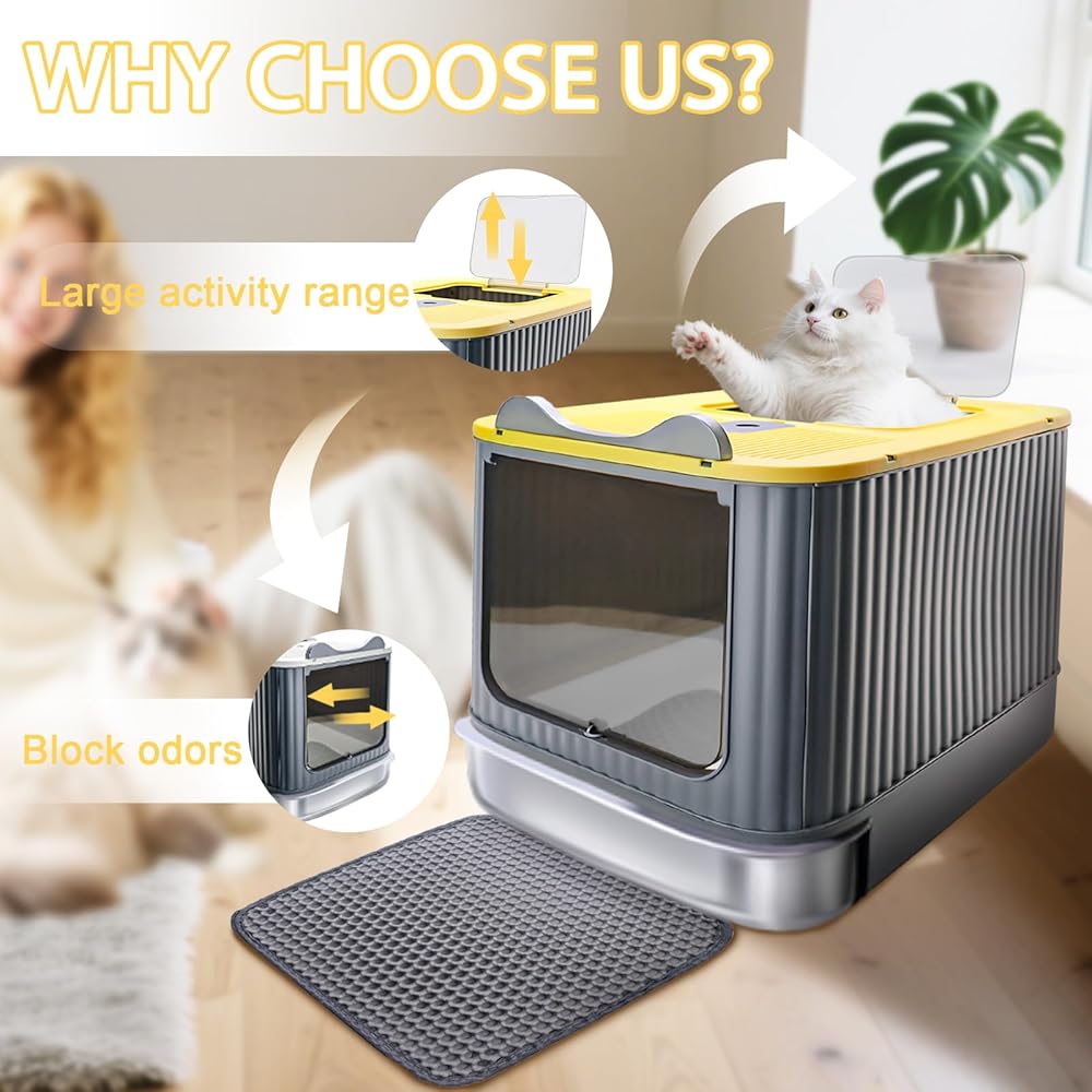 【تصميم مغلق، تحكم فعال في الرائحة】 - يعتمد صندوق فضلات القطط نظام دخول وخروج ثنائي الاتجاه، كما يحبس الباب ذاتي الإغلاق الروائح وفضلات القطط بشكل فعال. الدواسة العلوية تمنع تناثر السوائل وتوفر مساحة تنظيف خاصة للقطط.
