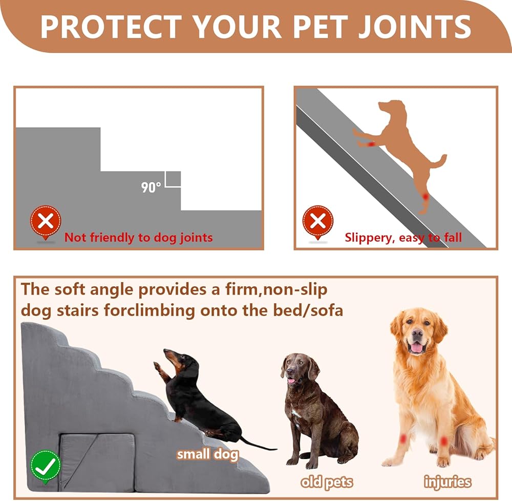 • سلالم الحيوانات الأليفة الخاصة بنا مصنوعة من إسفنجة عالية الكثافة، والتي تتمتع بمرونة جيدة ولا تتشوه بسهولة. كما توفر الرغوة الناعمة حماية كبيرة لمفاصل الكلاب. الجزء السفلي من الدرج مجهز بأنماط مضادة للانزلاق، مما يضمن عدم تحرك الدرج بسهولة ويمنح حيواناتك الأليفة المحبوبة شعورًا بالأمان. نوصي باستخدامه للحيوانات الأليفة التي تزن 60 رطلاً أو أقل