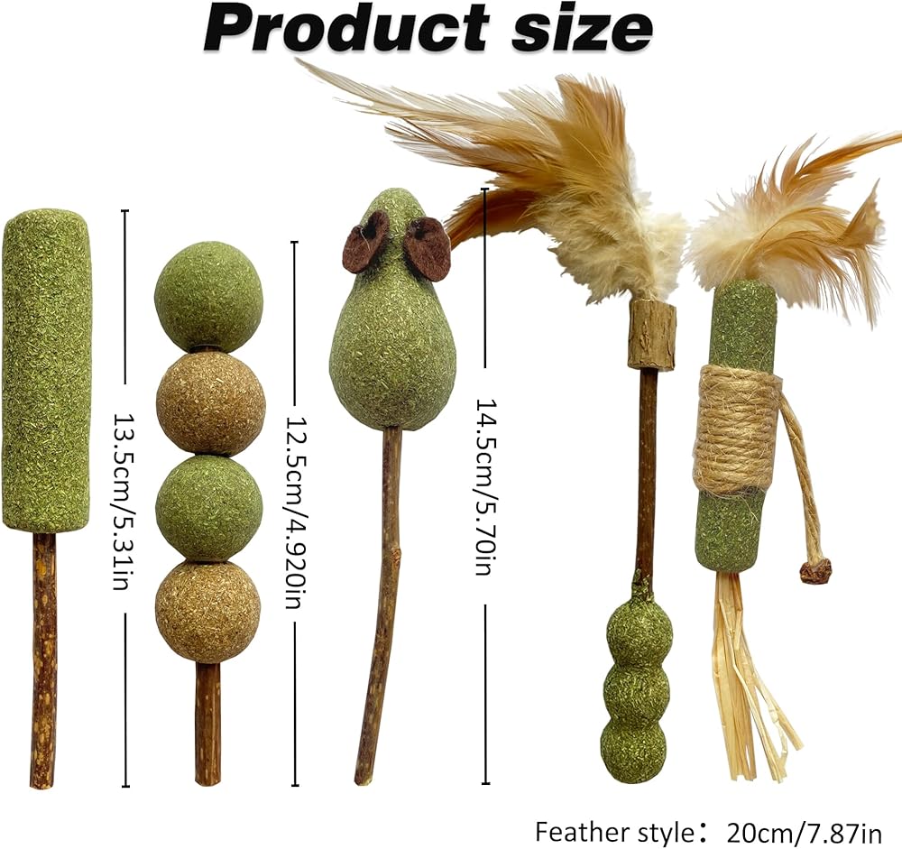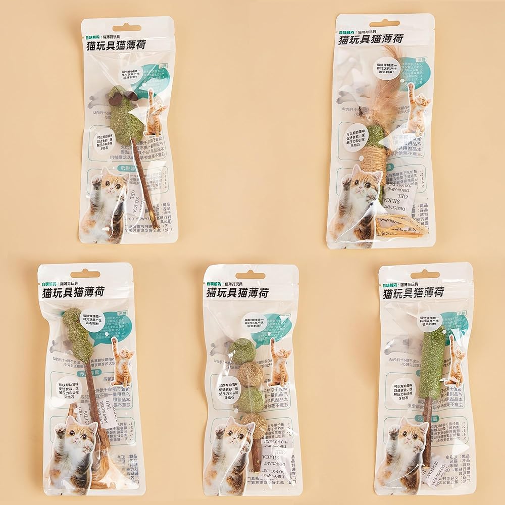 • 【NEW】😺 new pet cat mint lollipop toys, 5 different designs, consisting of knotweed, SILVERVINE, feather, hemp rope, hay, felt cloth and SILVERVINE Gall Fruit, satisfying all the cat 's preferences at once.