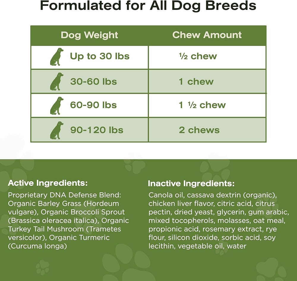 العلم + الأطعمة الفائقة: تحتوي مضغنا الناعم على مزيج عضوي خاص، ويتم تصنيعه في الولايات المتحدة، بمكونات من الولايات المتحدة الأمريكية، ومن الخارج، ويتم الحصول عليها خصيصًا لتوفير أعلى مستويات الجودة والنقاء والسلامة. مدعومًا بفطر ذيل الديك الرومي العضوي للكلاب، وعشب الشعير، وبراعم البروكلي، والكركم، هذا المزيج الخاص يوفر النباتات الطبيعية الأكثر ثقة من أجل صحة الجسم بالكامل.