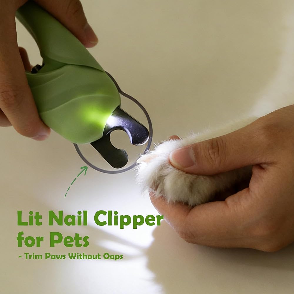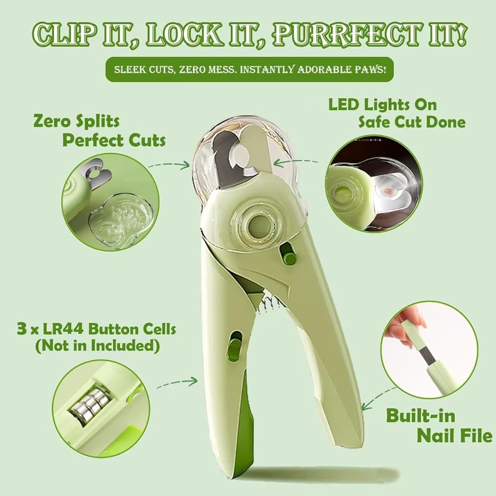 3-IN-1 CAT NAIL CLIPPER (NOT INCLUDED 3PCS LR44 BUTTON CELLS): Stainless steel blade for sharp, effortless cutting; Transparent Shield to catch clippings, mess-free cleanup; Hidden Nail File In The Handle to polish edges, smooth and safe nails. If you want the lighting function, you need to buy 3pcs LR44 button cells by yourself.