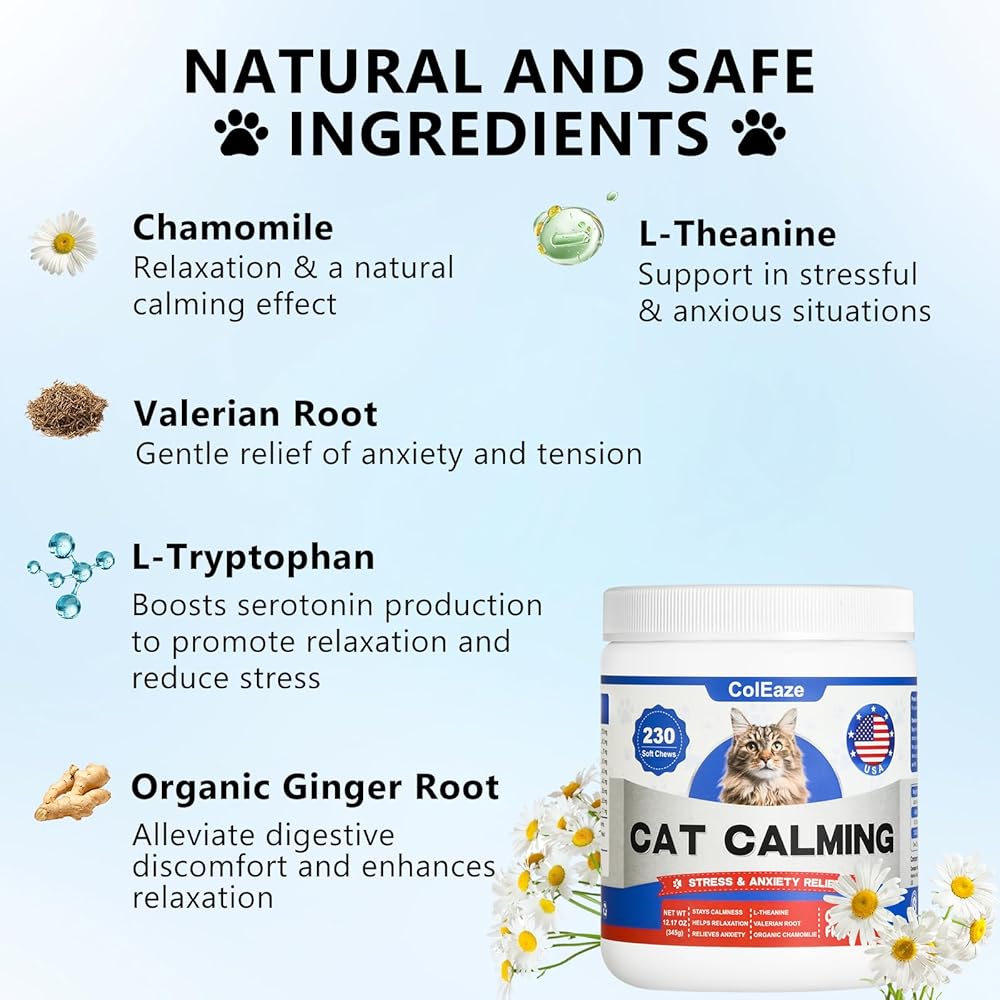 ColEaze Calming Chews for Cats are premium chewables that aid cats with normal stress, nervousness, and hyperactivity to help them stay calm and at ease.This functional cat calming treats supplement features Suntheanine, an advanced form of L-Theanine to support relaxation and calmness for your feline pet. Plus, these soft chews also include L-Tryptophan, Chamomile for additional support to help calm and relax your kitty companion.Best of all, pets love the delicious taste that'll give your cat an itch for more.