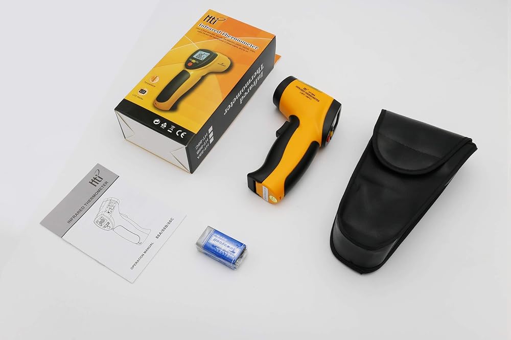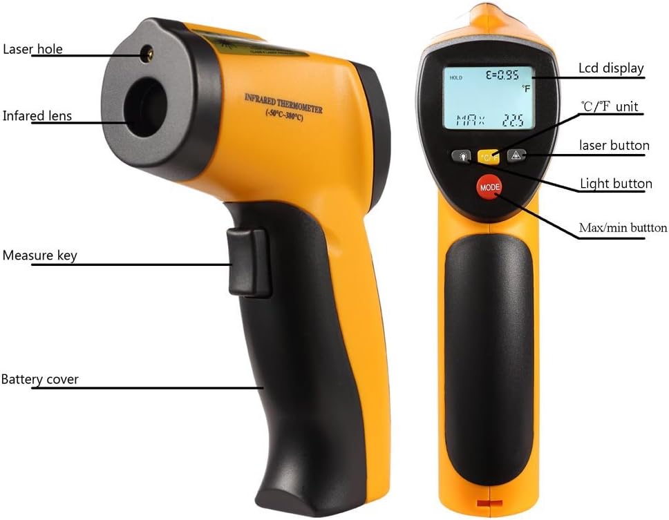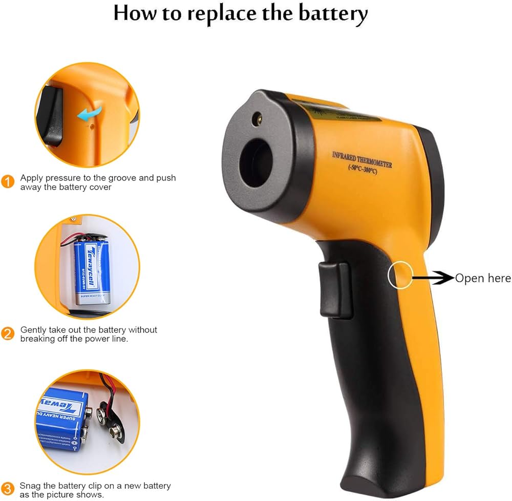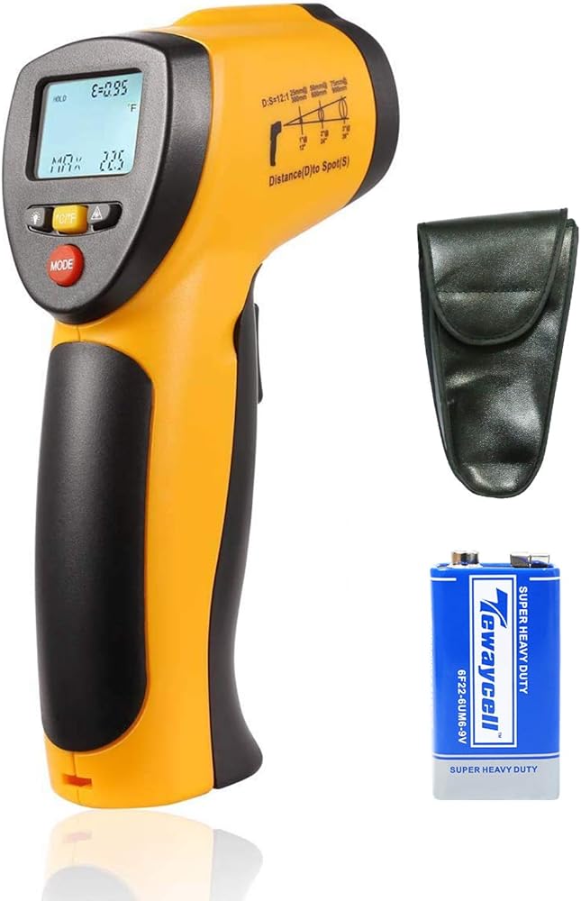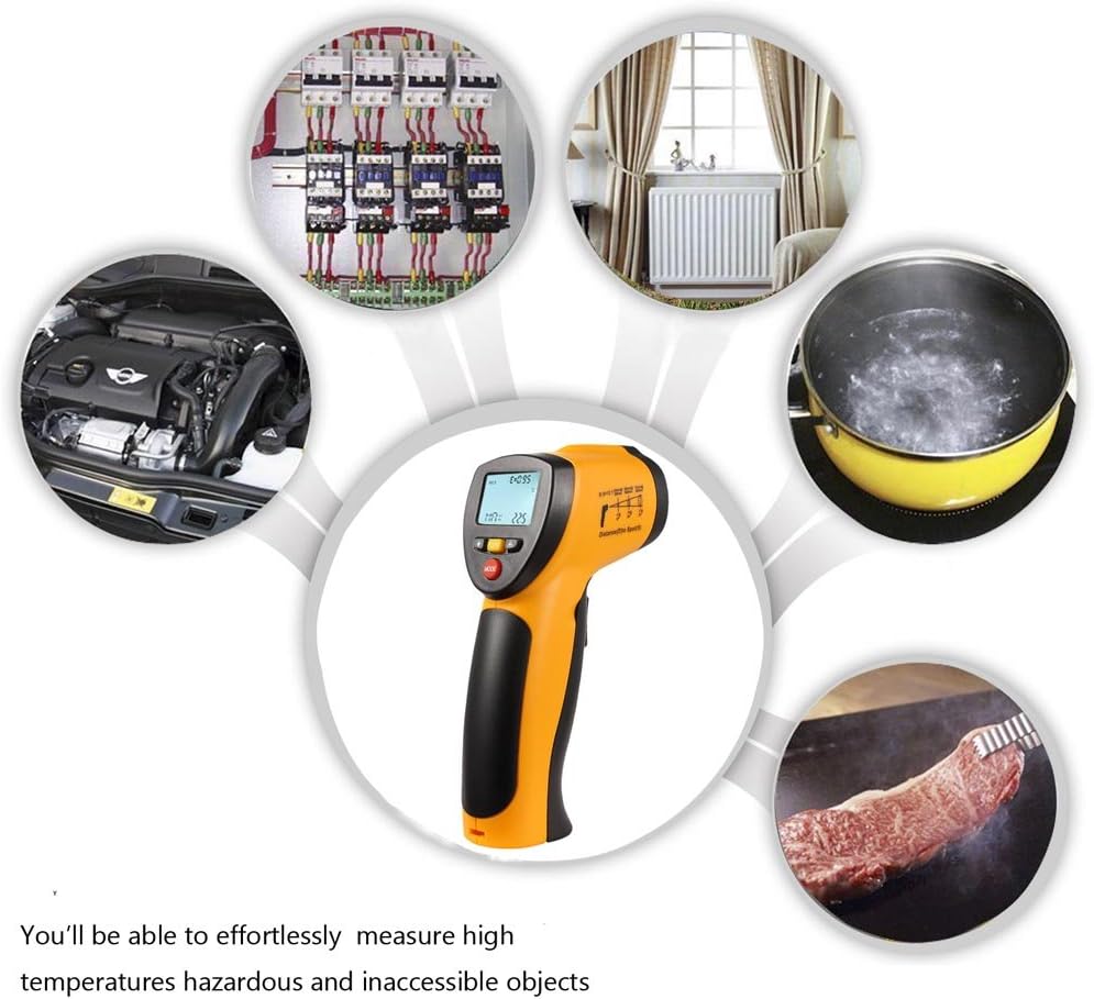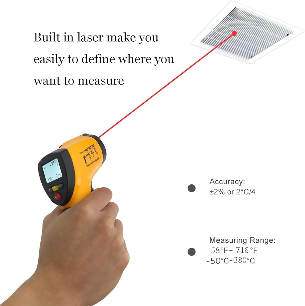 ميزان حرارة رقمي بالأشعة تحت الحمراء، مسدس درجة حرارة ليزر بدون تلامس -58 درجة فهرنهايت ~ 716 درجة فهرنهايت (-50 درجة مئوية ~ 380 درجة مئوية) لطهي الطعام، صيانة السيارات، إصلاحات المنزل (بطارية 9 فولت متضمنة)