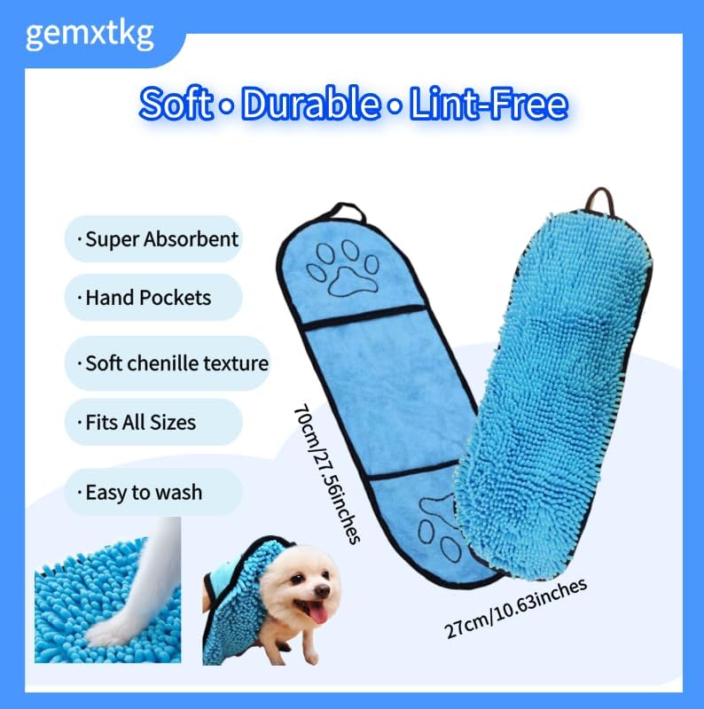 مجموعة مناشف حمام وقفازات غسيل للحيوانات الأليفة فائقة الامتصاص - منشفة تجفيف للكلاب من قماش شانيل ناعمة مع جيوب يدوية، سريعة الجفاف، قابلة للغسل في الغسالة، غير سامة ومتينة للكلاب والقطط الصغيرة والكبيرة، باللون الأزرق