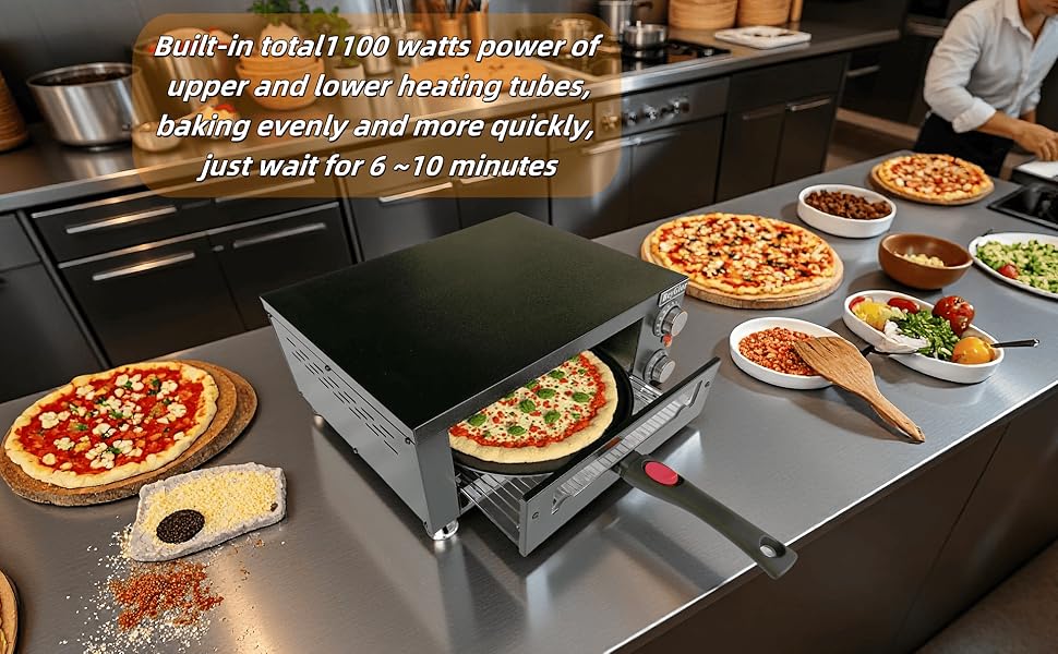• الخبز بالتساوي والتسخين السريع: مع قوة 1100 واط مدمجة لأنابيب التسخين العلوية والسفلية لفرن البيتزا الكهربائي، تسخن حتى 625 درجة فهرنهايت، يمكن تسخين البيتزا بالتساوي والمقرمشة وبسرعة أكبر، فقط خبز لمدة 6 إلى 10 دقائق.