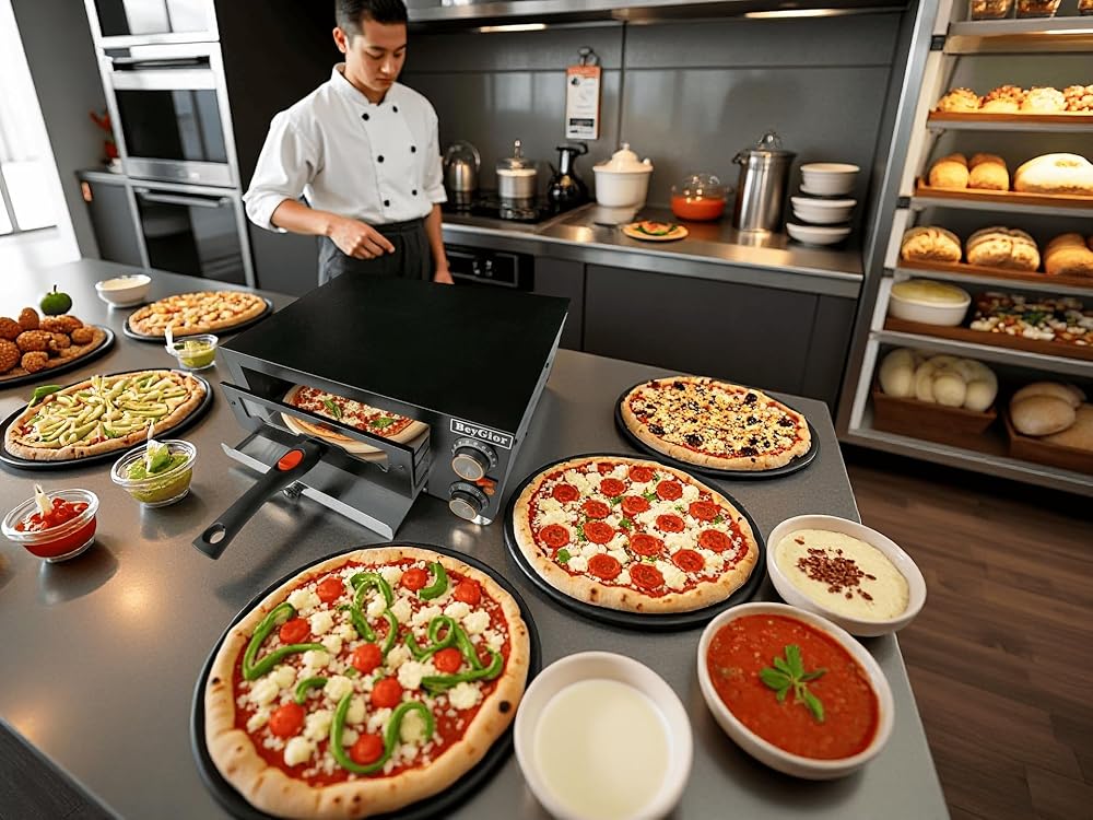 • تصميم نافذة الرؤية الشفافة: بفضل النافذة الزجاجية المقواة المقاومة للانفجار، تتيح لك مراقبة إبداعك في الطهي بينما يقوم صانع البيتزا بسحره.