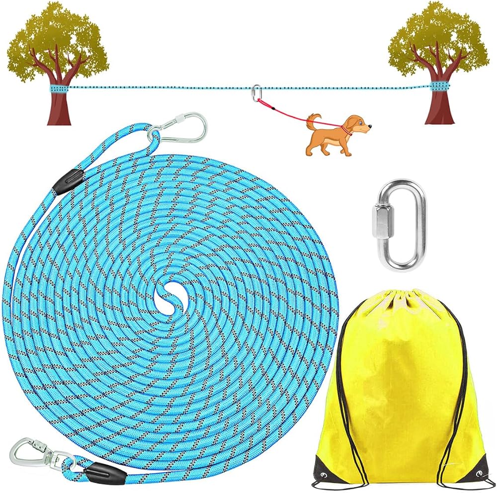 كابل ربط كلب عاكس متعدد الوظائف بطول 60 قدم للتخييم والفناء الخلفي، نظام عربة عداء للكلاب يصل وزنها إلى 300 رطل، مقود طويل بسحاب خارجي مع مقبض وحلقة اتصال قابلة للإزالة