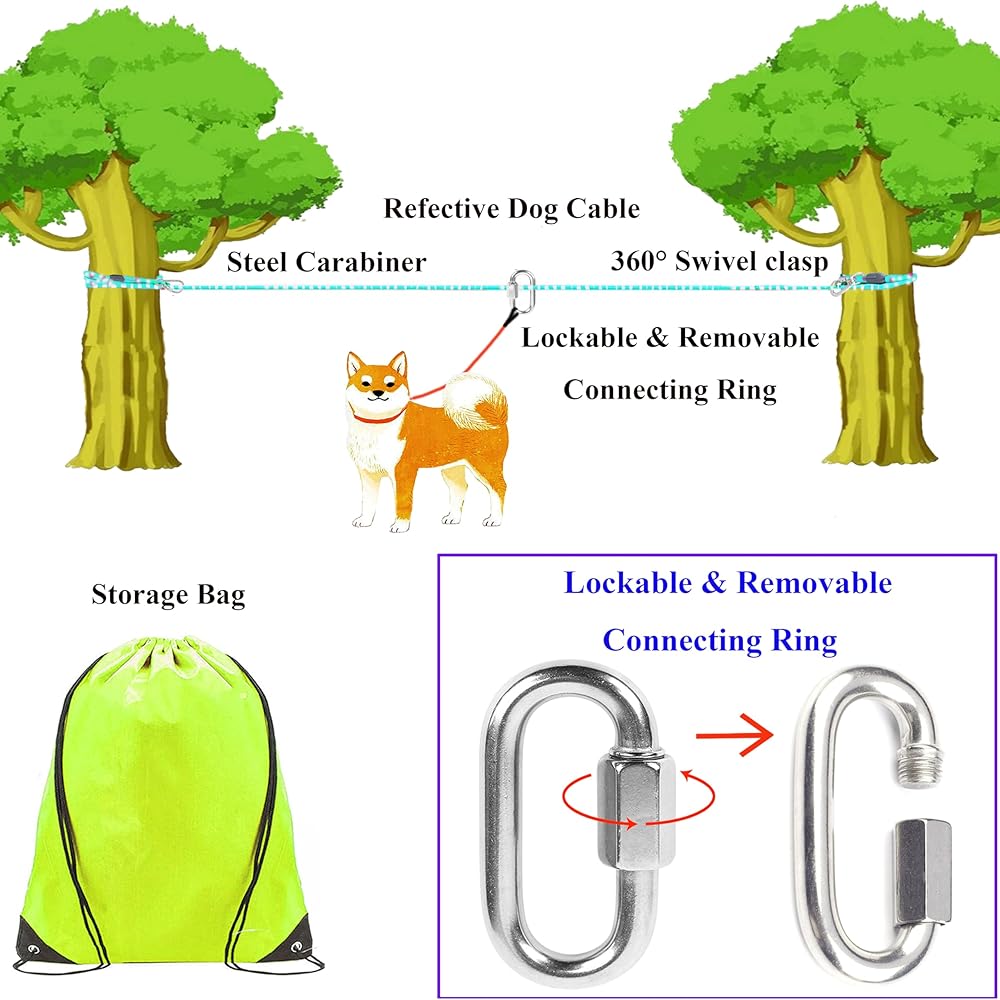 • 3. سهل الاستخدام: ما عليك سوى ربط طرفي كابل تشغيل الكلاب هذا بشجرتين، ثم قم بتوصيل مقود الكلب بحلقة الاتصال، ثم تم تصميم قفل المسمار لضمان عدم فتح الكابل المقفل بواسطة الكلاب أبدًا. يمكن تركيب نظام العربة بواسطة شخص واحد خلال 5 دقائق فقط.