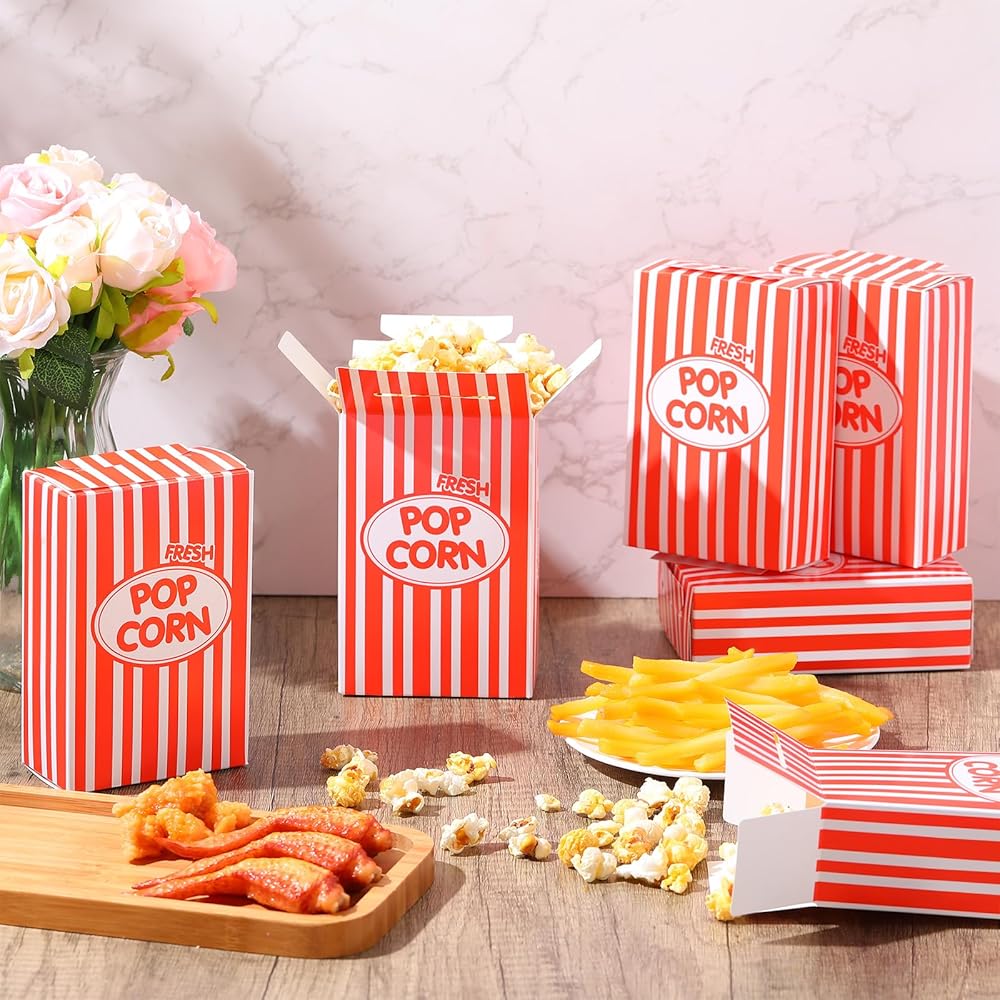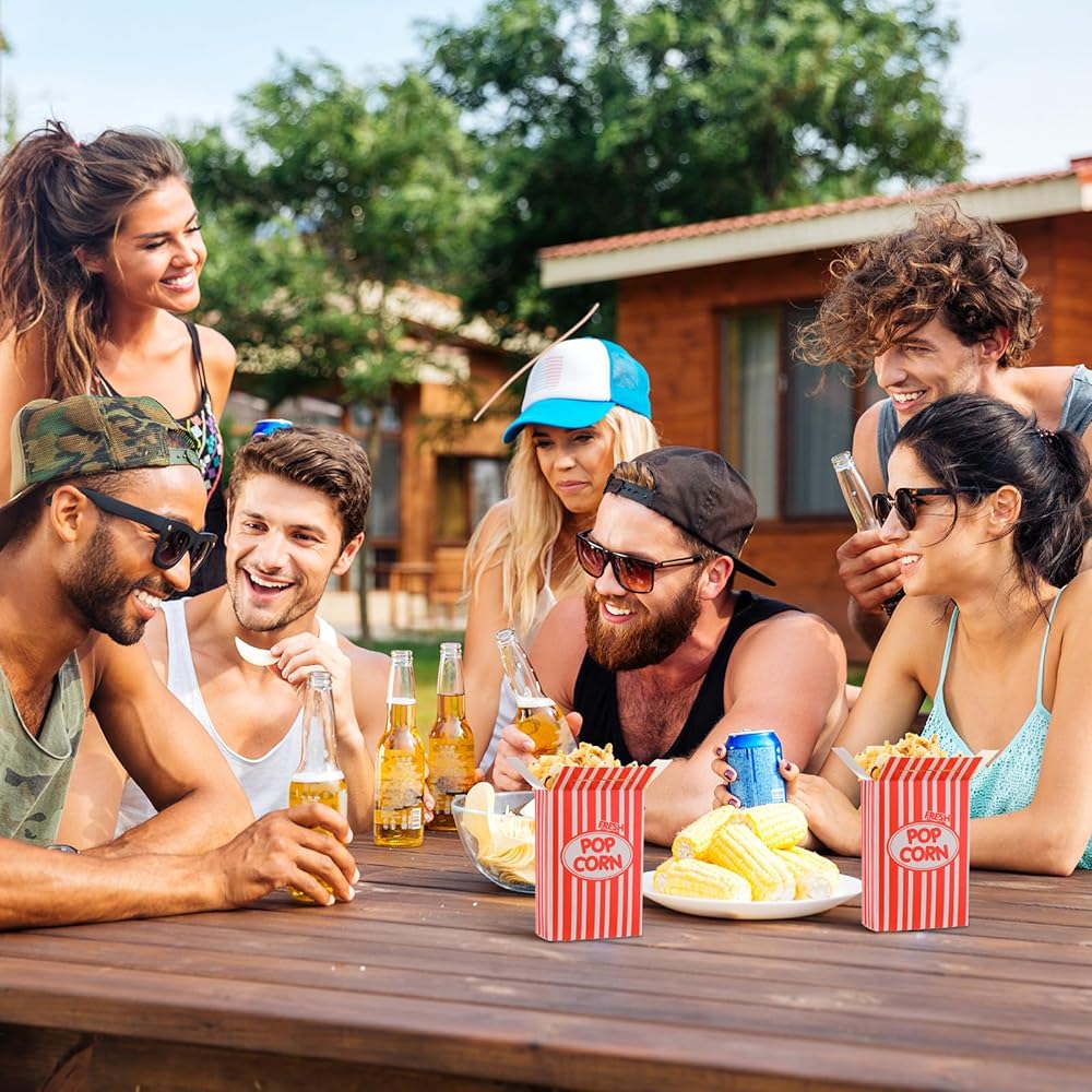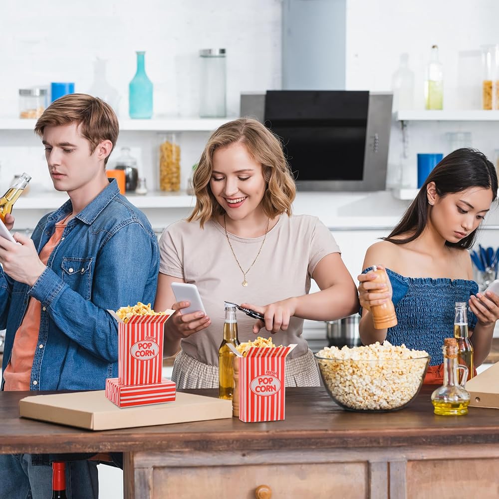 تصميم مخطط باللونين الأحمر والأبيض: تم تصميم حاويات الفشار المقاومة للزيت للاستعمال مرة واحدة بقاعدة مسطحة، حتى تتمكن من الوقوف بشكل مستقيم على أسطح الطاولات الناعمة، إلى جانب التصميم المخطط التقليدي باللونين الأحمر والأبيض الذي يتوافق مع المعايير الجمالية لمعظم الأشخاص، مما يضيف جوًا ممتعًا