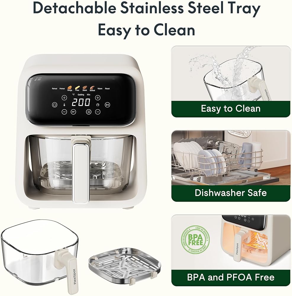 مقلاة هوائية زجاجية 4.2QT، بدون طلاء، 8-1 إعدادات مسبقة، وعاء زجاجي TempWare، تصميم شفاف، آمن للاستخدام في الفريزر وغسالة الأطباق، التحكم في درجة الحرارة حتى 400 درجة فهرنهايت، بيج كريمي