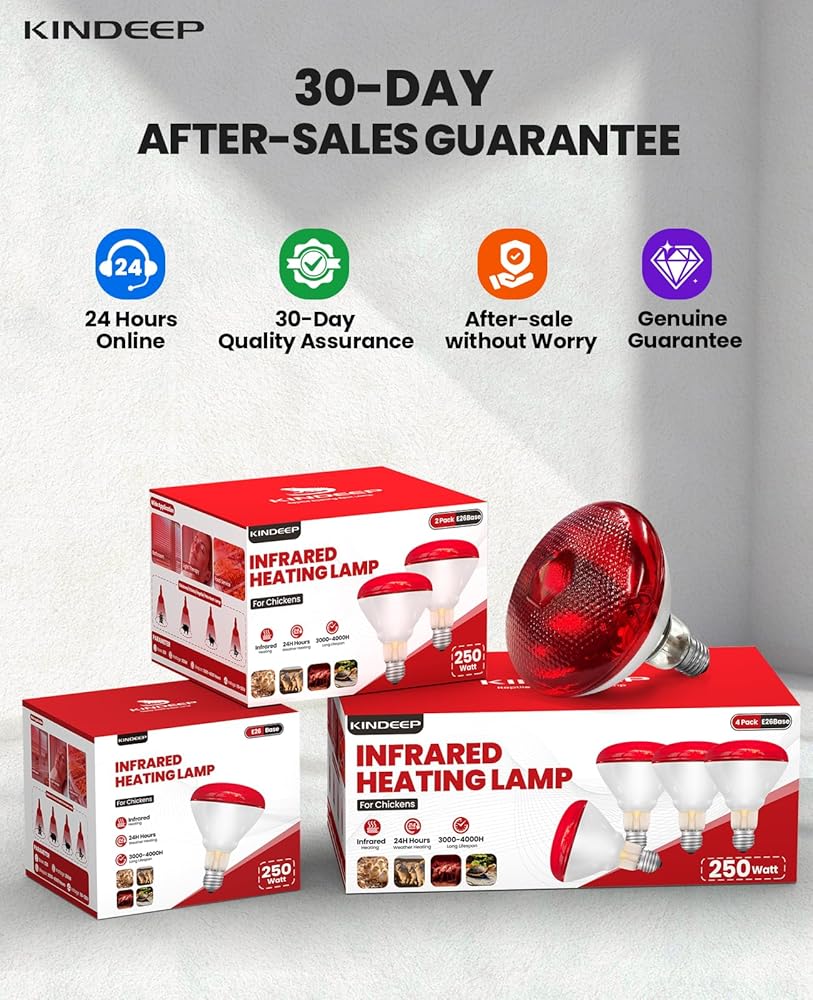أداء تسخين قوي - تم تصميم مصباح الحرارة بالأشعة تحت الحمراء KINDEEP 250W لتوفير كفاءة تسخين لا مثيل لها لأقفاص الدجاج والحيوانات الأليفة والحيوانات الصغيرة. بفضل إمكانيات التسخين السريع، فإنه يضمن بقاء قطيعك وأصدقائك ذوي الفراء دافئين ومرتاحين حتى في أبرد الظروف.
