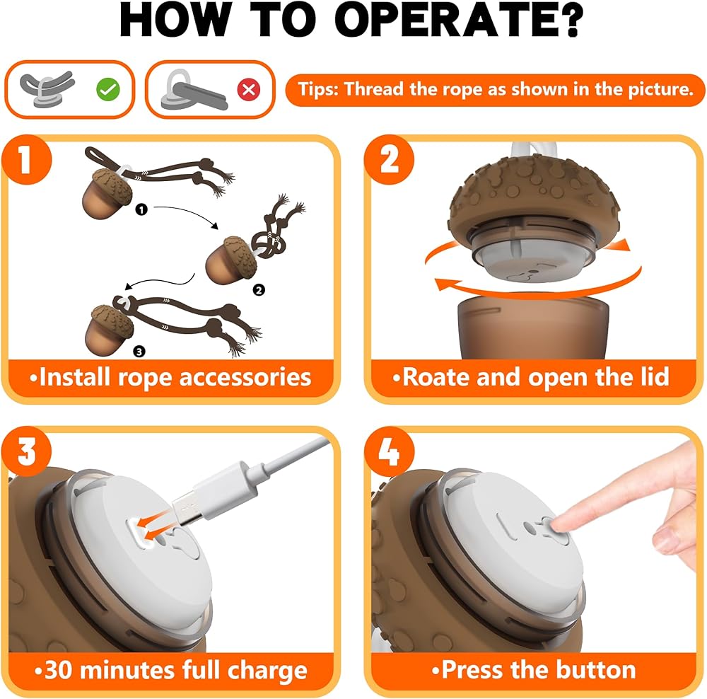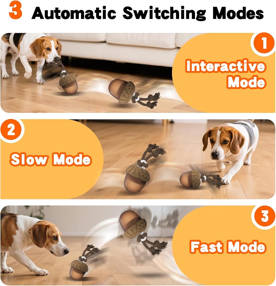 [ثلاثة أوضاع لعب للكلاب] هناك ثلاثة أوضاع لعب للكرة المتدحرجة للكلاب: اضغط على الزر للتبديل تلقائيًا بين الجري السريع والجري البطيء والوضع التفاعلي. تأتي لعبة الكلب التفاعلية بحبل متين يتأرجح بحرية عندما تتدحرج كرة لعبة الكلب، مما يجذب كلبك الصغير للمطاردة والسحب والمضغ واللعب. تتميز لعبة الكلب هذه بشكل بلوط فريد من نوعه، مما يجعلها خيارًا مثاليًا لألعاب الكلاب في عيد الميلاد.