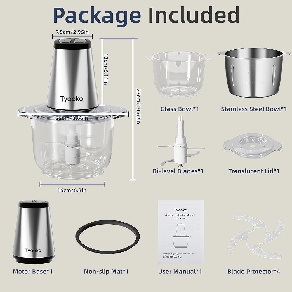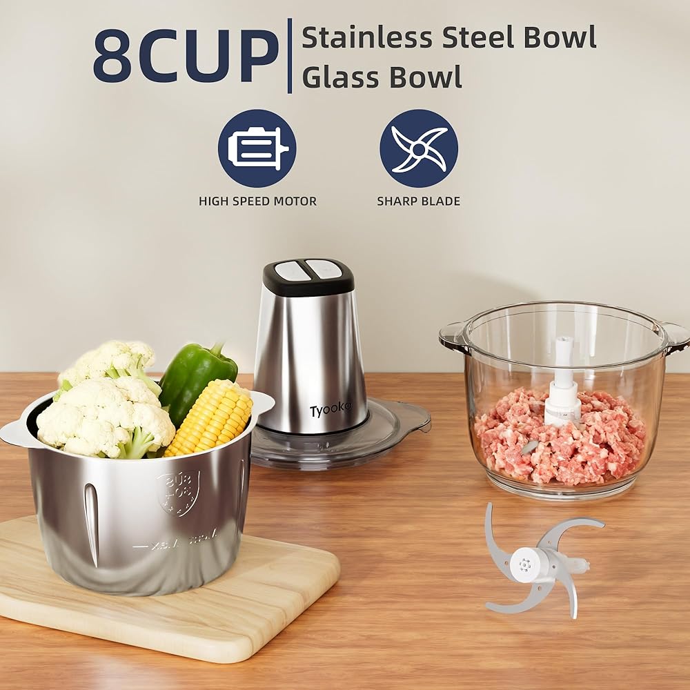 محضرة طعام كهربائية، مفرمة خضروات، أداة مساعدة في المطبخ، مفرمة لحم سهلة التنظيف مع وعاءين (8 أكواب من الفولاذ المقاوم للصدأ + 8 أكواب زجاجية)، خلاط طعام صغير للفواكه/اللحوم/المكسرات/الأسماك/الخضار/أغذية الحيوانات الأليفة/أغذية الأطفال
