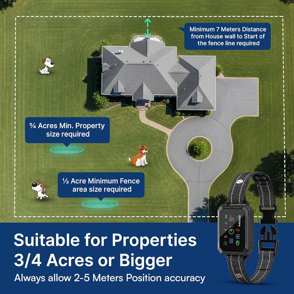 تغطية الممتلكات الكبيرة - ليس للساحات الصغيرة أو العقارات إلا إذا كنت لا تحتاج إلى جميع جوانب السياج المحيطي مثل السياج الخاص بك). يتطلب الحد الأدنى لمساحة العقار ¾ فدان (½ فدان كحد أدنى لمساحة السياج). يغطي ما يصل إلى 3533 فدانًا (1430 هكتارًا). قم بإنشاء الحدود وحفظها بسهولة باستخدام هاتفك الذكي المتصل بتقنية Bluetooth للحصول على سياج كهربائي آمن للكلاب.