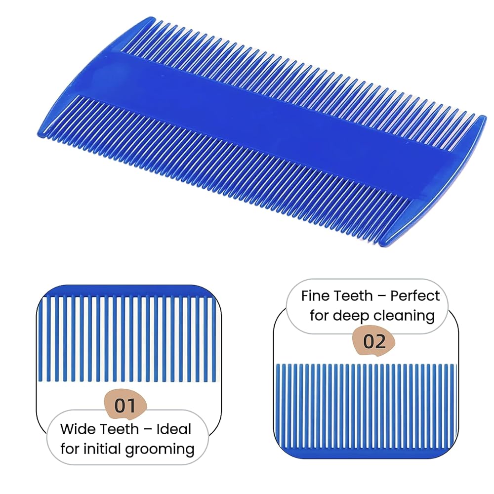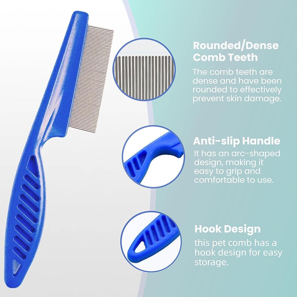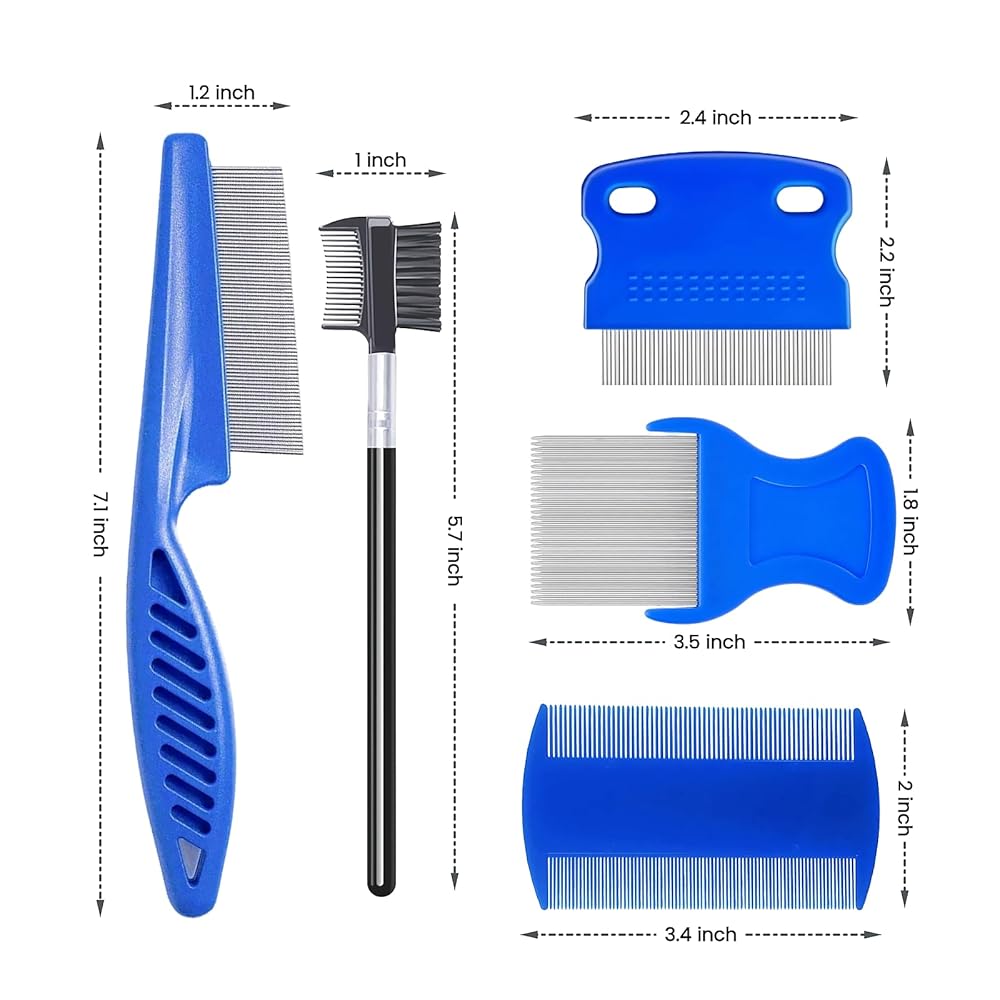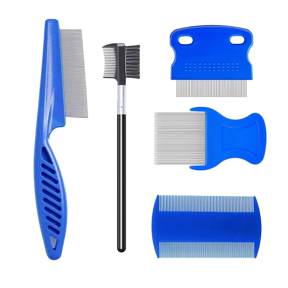 مجموعة من 5 أمشاط للبراغيث والقمل للقطط والكلاب والأطفال - طقم مشط ذو أسنان دقيقة من الفولاذ المقاوم للصدأ مع مزيل للبقع المسيل للدموع على الوجهين، وفرشاة للعناية بالشعر السميك (أزرق)