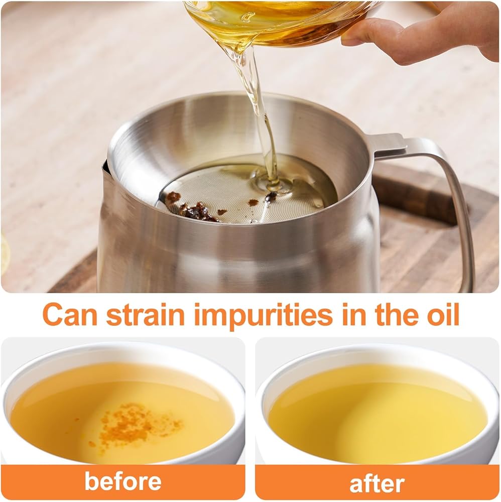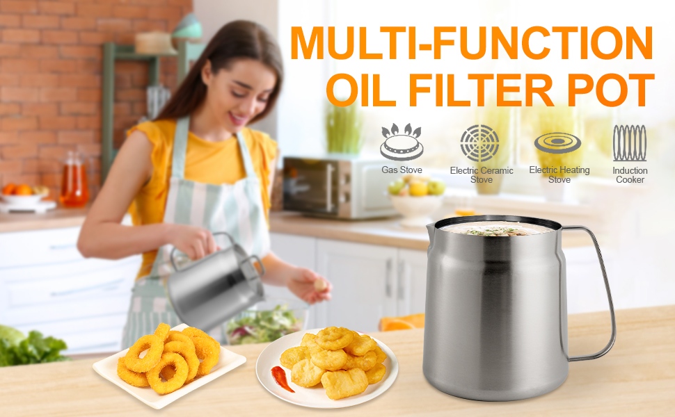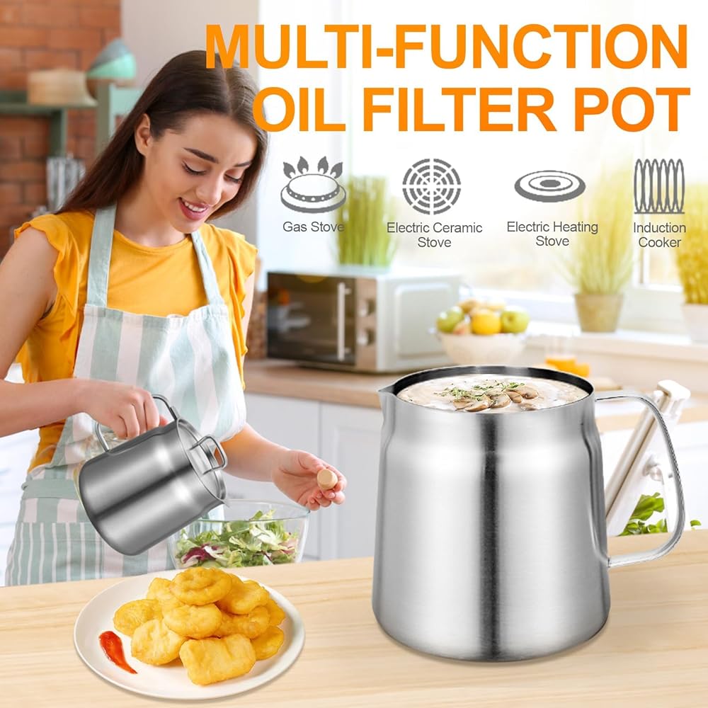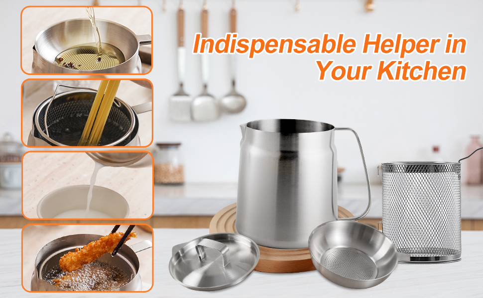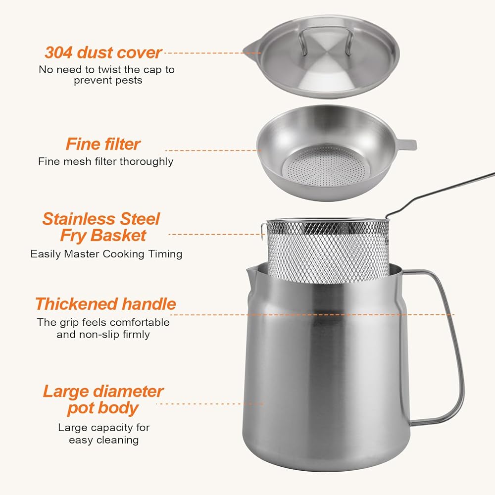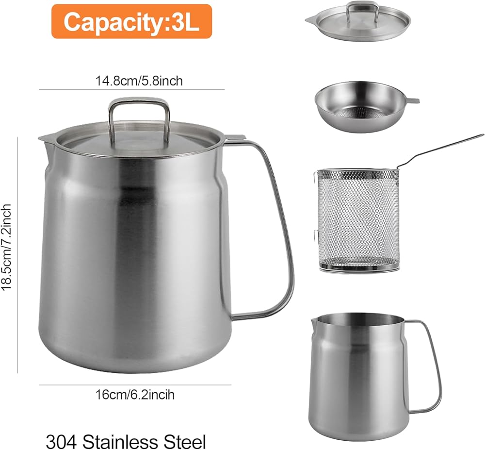 وعاء مقلاة عميقة من الفولاذ المقاوم للصدأ 304 مع سلة ومصفاة، القلي، الطبخ، التخييم، حاوية فلتر الزيت، 3.5 لتر (3.5Qt)