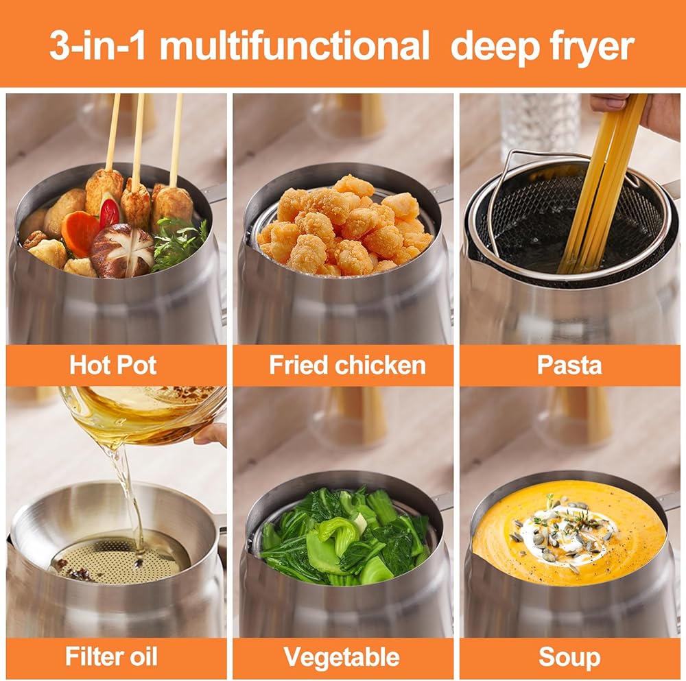 - [مقلاة ذات سعة كبيرة 3.5 لتر] حجم مثالي للعائلات الصغيرة أو الطبخ الفردي، قم بقلي كميات لذيذة من التمبورا أو قطع الدجاج أو البطاطس المقلية.