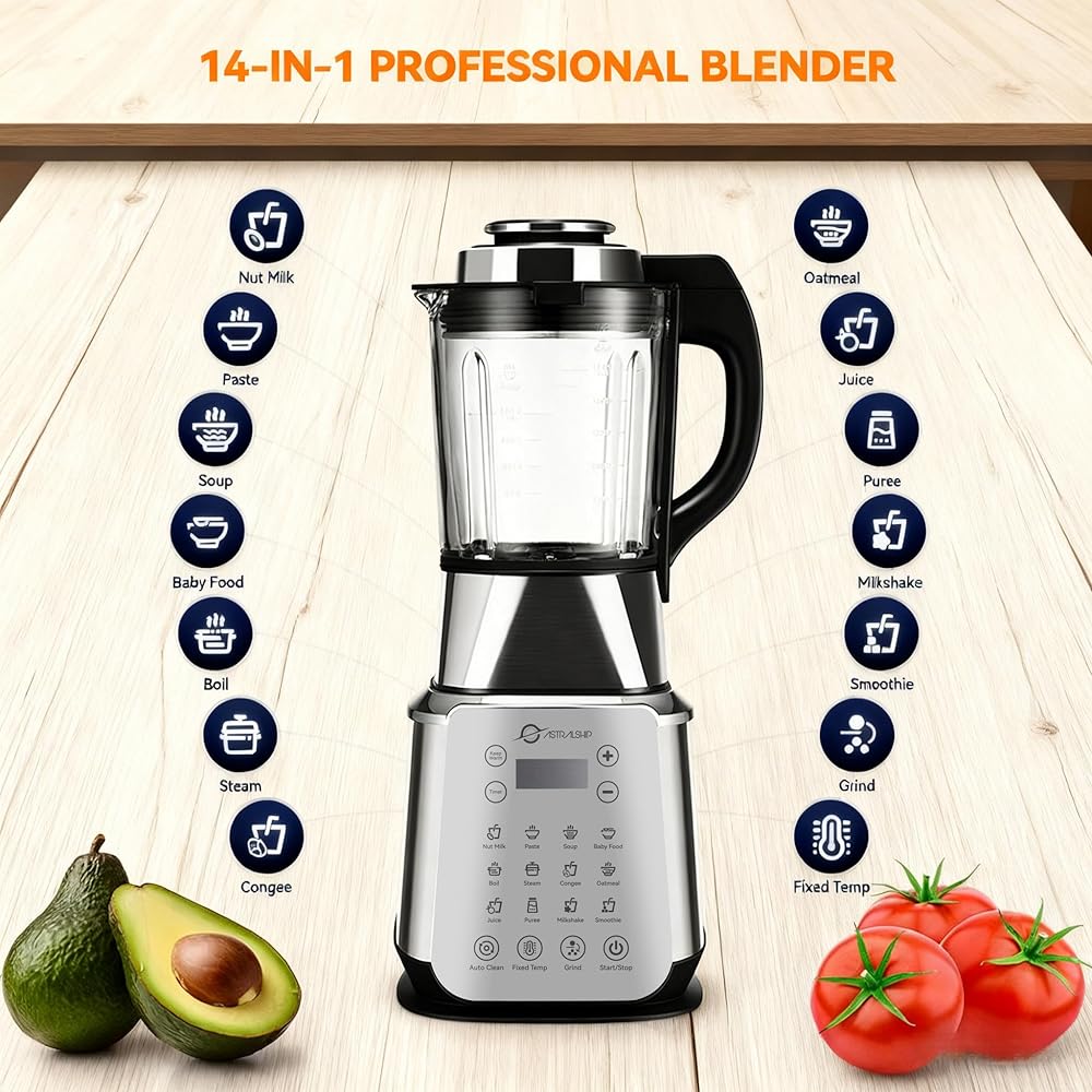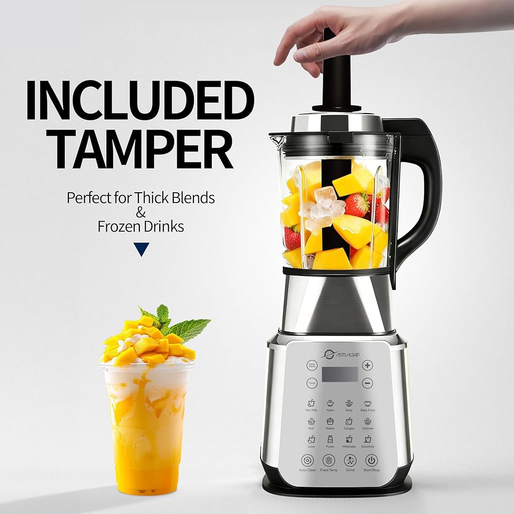 خلاطات للمطبخ، خلاط احترافي من الفولاذ المقاوم للصدأ بقدرة 1500 وات للعصائر، وعاء زجاجي سعة 59 أونصة، خلاط على سطح الطاولة مع مكبس، محضر طعام مع تسخين، 14 برنامجًا ذكيًا، ASH01-S Pro Auto Clean