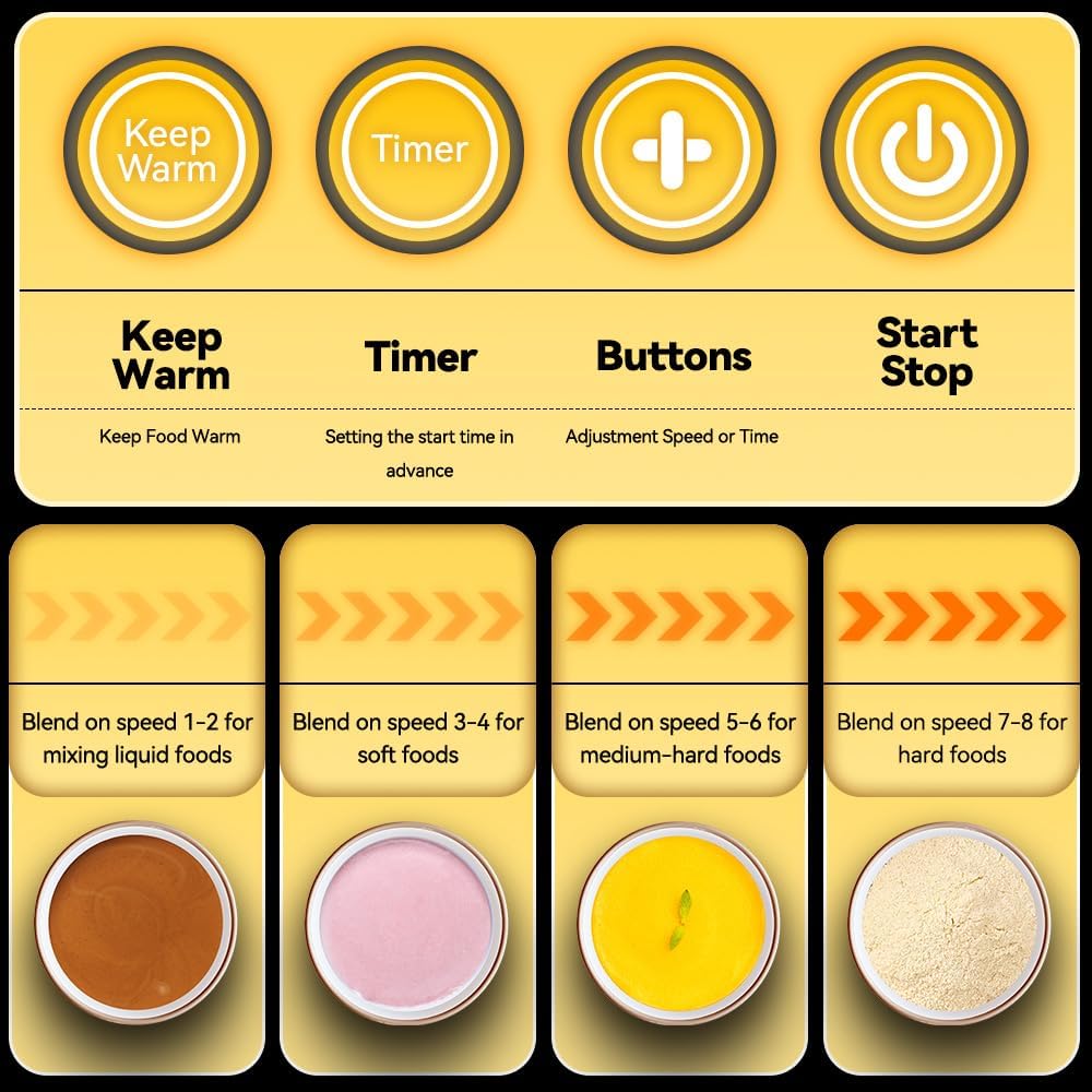 【14 برنامجًا محددًا مسبقًا + أوضاع يدوية】 اختر من بين 14 برنامجًا معدًا مسبقًا بلمسة واحدة، يغطي كل شيء بدءًا من العصائر ودقيق الشوفان إلى الحساء والصلصات. كما يسمح المؤقت المدمج أيضًا ببدء التشغيل المؤجل للبرامج الساخنة، مما يدعم الإعداد المريح للوجبات. بالنسبة للمستخدمين المتقدمين، يوفر التحكم اليدوي في السرعة (P1–P9) مرونة مطلقة.