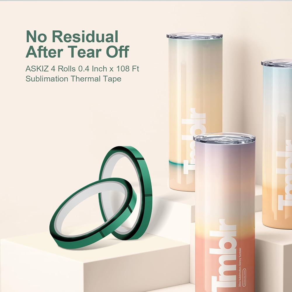 【حجم مثالي】مجموعة من 4 لفات، يبلغ عرض الشريط المقاوم للحرارة 0.4 بوصة وطوله حوالي 33 مترًا /108 قدمًا. شريط ضغط حراري طويل بما فيه الكفاية يمكن أن يلبي الاحتياجات اليومية في مواقف مختلفة، شريط حراري حراري لطباعة فراغات التسامي وغيرها من مشاريع DIY، مثل أكواب التسامي، والبهلوانات، والزجاجات، والأطباق، بجودة عالية لتسهيل الطباعة.